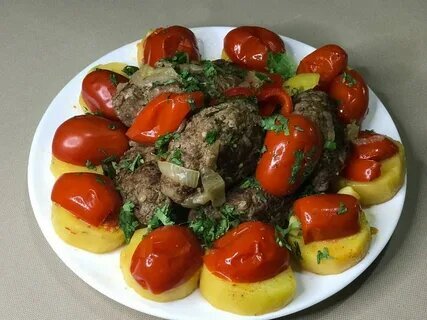 Ингредиенты Пошаговый рецепт приготовления Мясо и репчатый лук пропускаем через мясорубку. Солим и перчим по вкусу. Нарезаем мелко зелень кинзы и отправляем в фарш. Тщательно перемешиваем. Формируем котлеты и жарим в сковороде на растительном масле без запаха с каждой стороны до образования золотистой корочки. Перекладываем котлеты в горячий казан и готовим далее на сливочном масле.Поверх котлет укладываем репчатый лук, нарезанный полукольцами. Далее крупно нарезанный картофель, подсаливаем. Укладываем нарезанный болгарский перец. Заканчиваем слоем разрезанных помидоров. Каждый слой сдабриваем куркумой, кориандром и жгучим красным перцем по вкусу. Закрываем казан крышкой и готовим на слабом огне 1( один) час. Ну, вот и всё! Блюдо готово! Приятного аппетита!!!