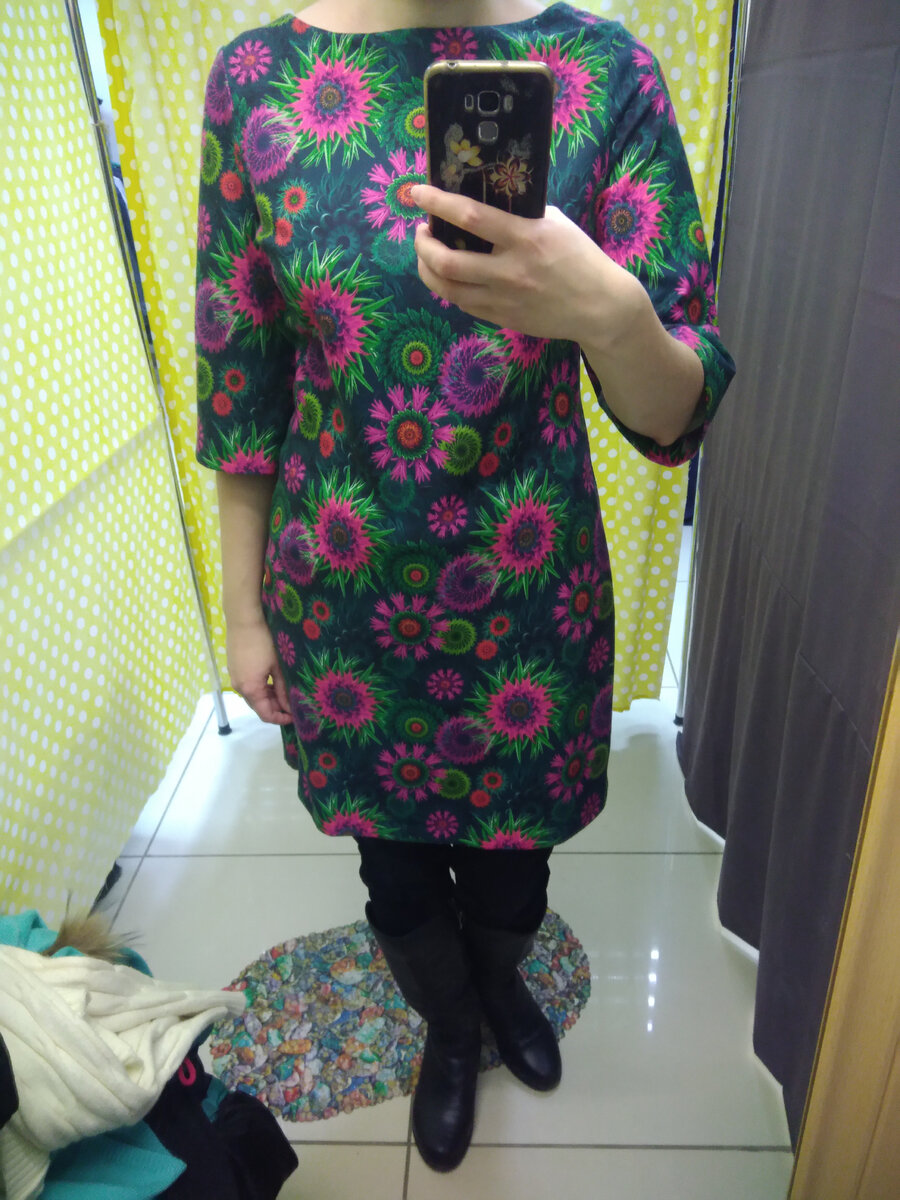 Зашла в наш местный секонд. Хотя наверное неверно его так назвать, это скорее благотворительный магазин, даже не комиссионка. Что за магазин такой? Туда местные сносят бесплатно одежду, которая им уже либо мала, либо надоела, но она еще в хорошем состоянии. Я тоже неоднократно уносила туда свою одежду, это удобно, тем более мне от дома не так далеко идти до этого магазина. Еще для удобства в нашем городе поставили боксы для сбора текстиля, одежда тоже пойдет на переработку либо на благотворительность. Мне нравится, что в магазине стоят всегда коробки, где все по 50р., то что долго не покупается отправляется туда, и надо сказать, вещи там не всегда плохие. Я сегодня выбрала 3 вещи по 50р. 1.Платьишко фирмы Evrika. Достаточно теплое, к телу приятное. Принт интересный, яркий. Но все же решила не брать, в основном я на работу такой вариант буду носить, но для работы мне ярко. Да и гардероб лишний раз забарахлять неохота. 2. Теплый мягкий свитерок молочного цвета. Фирма неизвестна, бирка о
