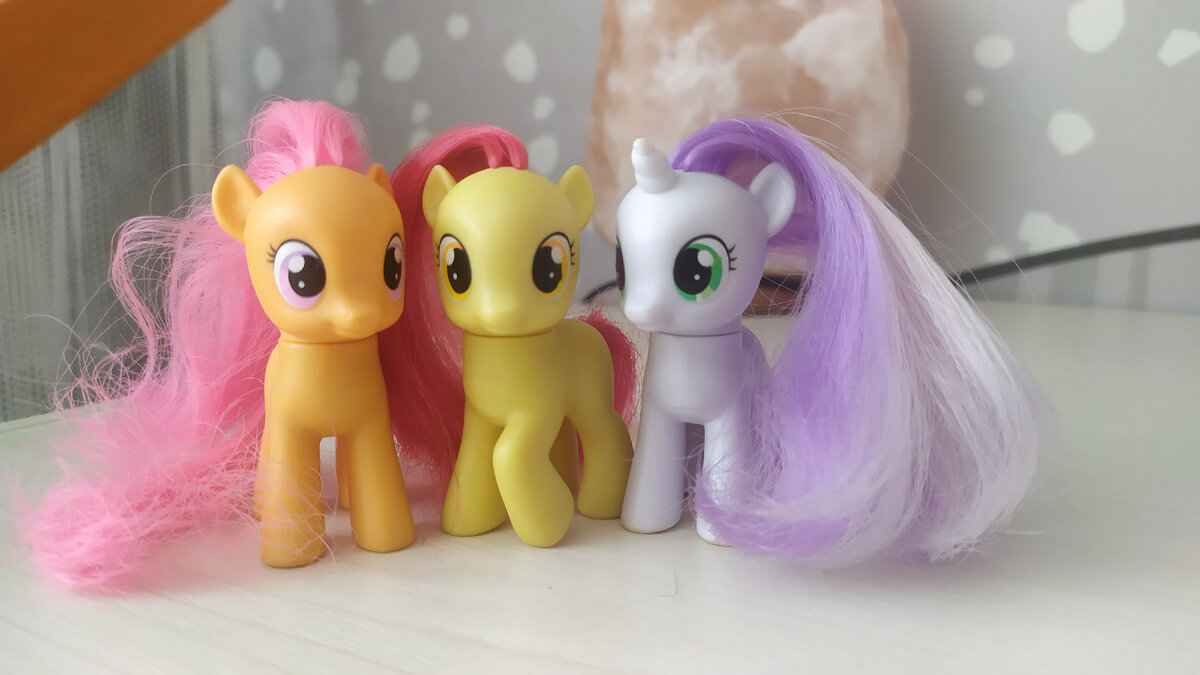 Да, ребята, это то, чего вы так долго ждали! Обзоры возвращаются! Недавно моя коллекция пополнилась! А кем, вы сейчас и узнаете) Для тех, кто тут впервые. Это канал о вселенной "Мy little pony" и про все что с ней связано. Заваривайте чаёк и поскакали! 🐎 Сегодня я наконец-то получила пони, которых я так долго искала! Я перерыла всё Авито, но везде цены были космические. Но я всё же нашла объявление, где меня все устраивало. Пони были, новые, чистые, а гривы расчесанные и не мочаленные. Итак, встречайте! Эппл Блум, Скуталу и Свити Бель! Для начала опишем Эппл Блум: Высота 6,5 см. Земная пони. Жёлтое тело и оранжевые глаза. Поднятое копыто. Красная длинная грива и хвост. Знака отличия нет. По штампу на копытцах можно понять, что это оригинал. В сравнении с Эпплджек: Эппл Блум очень любит помогать своей сестре Эпплджек в яблочном саду. Теперь очередь Скуталу: Высота 6,5 см. Пегас. Сиреневые глаза. Оранжевое тело с маленькими крылышками. Длинная розовая грива и хвост. Знака отличия тож