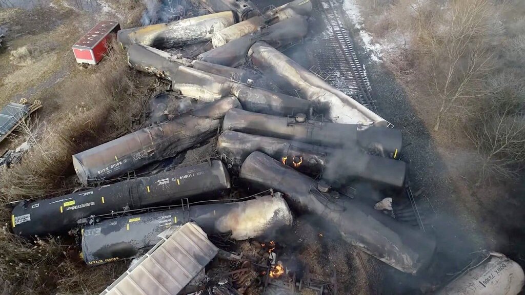 В Соединённых Штатах, а именно в штате Огайо, произошла настоящая экологическая катастрофа: крушение поезда Norfolk Southern Corp., перевозившего токсичные вещества, об этом пишет 5-tv.ru Власти подробности происшествия скрывают и ссылаются на то, что в поездах была простая «бытовая химия». Местные жители так не думают. Люди видят, как вся рыба в водоемах мгновенна погибла. Даже деревья сохнут прямо на глазах. Само происшествие произошло в пятницу 3 февраля. Поезд перевозил опасные химикаты, в том числе крайне ядовитое и легковоспламеняющееся вещество винилхлорид, одно из самых широко используемых химических соединений, так как оно является сырьем для производства ПВХ. Около полусотни цистерн по не установленным причинам сорвались с рельс неподалеку от городка Восточная Палестина (деревня в северо-восточном округе Колумбиана — прим. ред.), а их содержимое начало выливаться на землю. В небо Огайо поднялась гигантская иссиня-чёрная туча из ядовитых продуктов горения, плотно окутавшая Вос