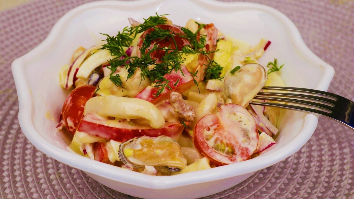 О пользе морепродуктов сказано многое. Это ценный источник белка, полезных минералов и витаминов. К тому же морепродукты – это вкусно, если уметь их правильно приготовить. А если такого умения нет? Не беда! Можно купить готовый к употреблению коктейль в маринаде и сделать с ним вкуснейший салат. Продукты: Приготовление Готовится салат очень просто. Нарежем длинными полосками вдоль стручка перец, затем разрежем эти полоски на 3-4 части поперек. Черри разрежем пополам. Если нет черри, то обычный помидор порежем кубиками. А чтобы салат не «поплыл», стоит предварительно убрать семена вместе с жидкостью. Тонкими полукольцами нарежем луковицу. Полукружьями порежем вареные яйца. Смешаем все продукты, добавим майонез и перемешаем. Осталось выложить готовый салат в салатник или на тарелку, можно украсить нарубленным зеленым укропом. А что делать, если готового коктейля из морепродуктов под рукой нет, но есть замороженный? В этом случае стоит начать приготовление заранее. Морепродукты предв