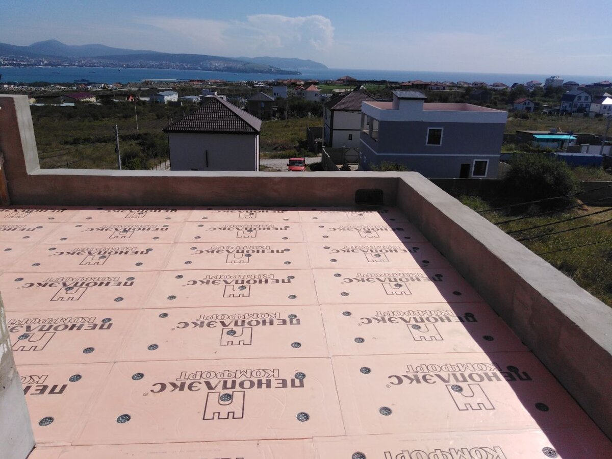 На момент начала кровельных работ у меня имелось ровное железобетонное монолитное перекрытие с парапетами, выполненными из газобетона.