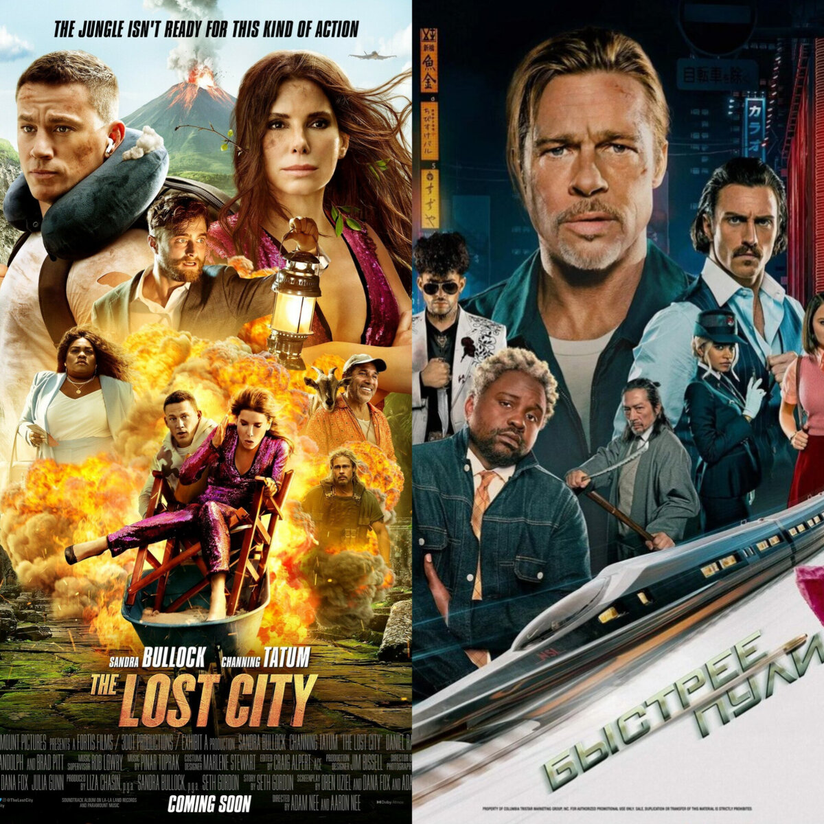 Вот в этих двух фильмах. Трейлеры обещали экшен. Начнём с Затерянного города. Там Сандра Буллок и Ченнинг Татум ищут древние сокровища пока Дэниел Рэдклифф пытается их убить. Закончила я просмотр на попе Татума. Прям смачным таким крупным планом показали почти все прелести актёра. Зачем спросите вы? Наверное, чтоб отвлечь зрителя от совершенно несмешных диалогов, да и вообще сюжета этого фильма. Плюс есть один это Бред Питт его там мало и он очень прекрасен) На этом всё. Переходим к фильму, где Бреда много и это хорошо) Правда бьют его там больно и смачно, но он парень не промах, дает отпор и наказывает обидчиков. "Быстрее пули" - многообещающий комедия-боевик Дэвида Литча. Поезд, чемоданчик, много желающих его отобрать из-за этого много драк, убийств и крови. Всё это очень динамично, стильно, интересно и смешно. Короче закрученно там всё, а это же отдельное удовольствие киномана смотреть и клубочек разбирать. Кто кого, за что убить хочет? Кто на кого работает? Ну и по классике