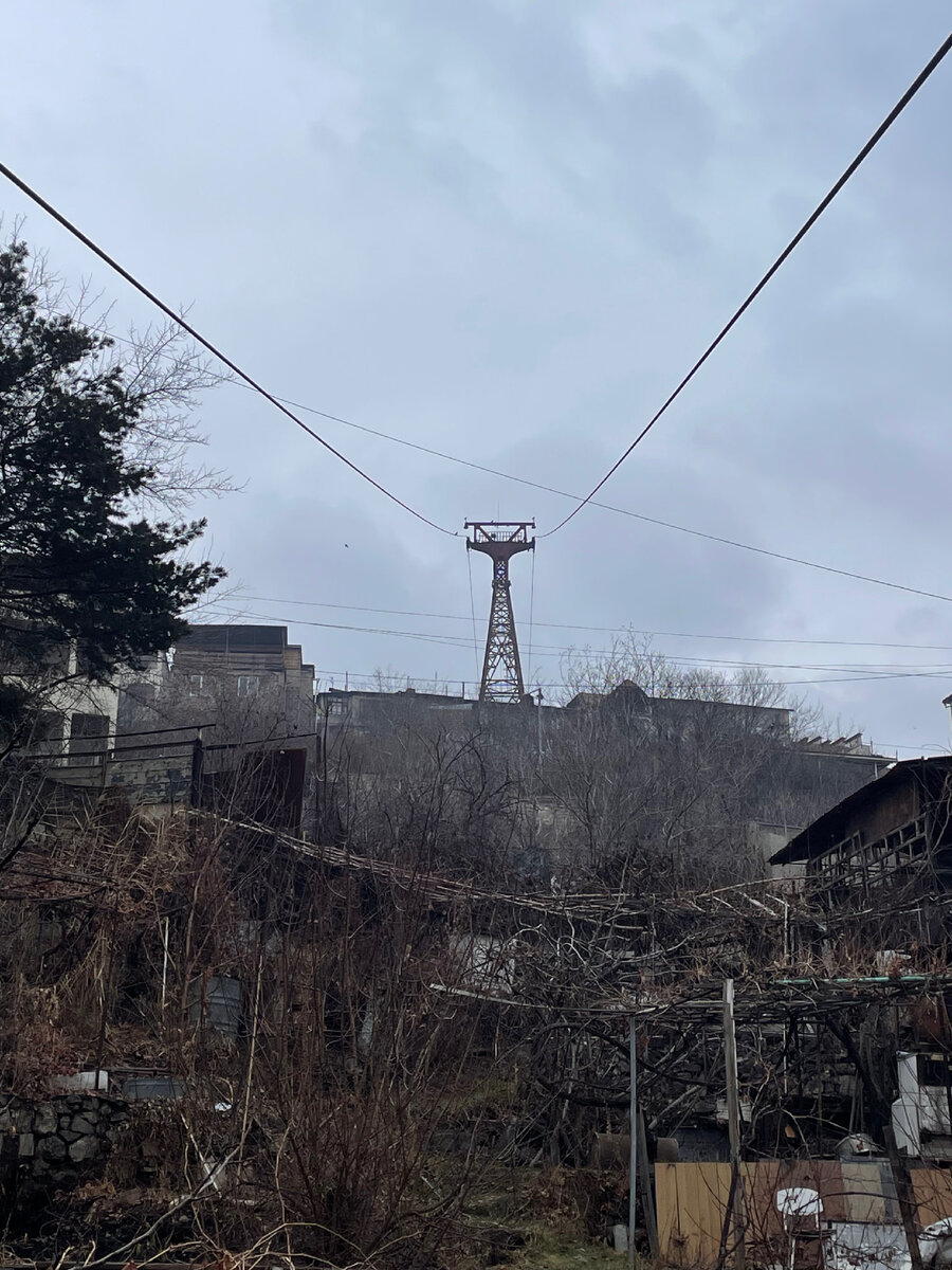 Я увидел её случайно, когда пошел гулять от станции метро Еритсардакан. Пройдя пару улиц заметил вдалеке опору, похожую на опору канатки. Решил пойти разведать. Я не ошибся, на улице Егише Чаренца, я увидел не только опору, но и здание станции. Она называется Гераци. Это была нижняя станция. Маршрут канатной дороги, протяженностью 600 метров связывал центр со спальным районом Норк. Советское круглое здание из бетона еще держится, хотя жизнь его конечно потрепала. Я поднялся по лестнице и посмотрел, что внутри. В помещениях куча мусора, каких-то тряпок, пахнет, мягко говоря, неприятно. Здесь давно устроили туалет. На стенах графити, лестницы разрушаются, но по ним еще можно подняться на второй этаж строения, откуда открывается вид на город. В шахтах видны остатки механизма, тросы, а рядом грустит вагончик в котором, когда-то поднимались наверх и спускались вниз люди. Теперь в нём лежат какие-то вещи, судя по всему, в кабинке периодически кто-то живет. Ереванская канатная дорога была з