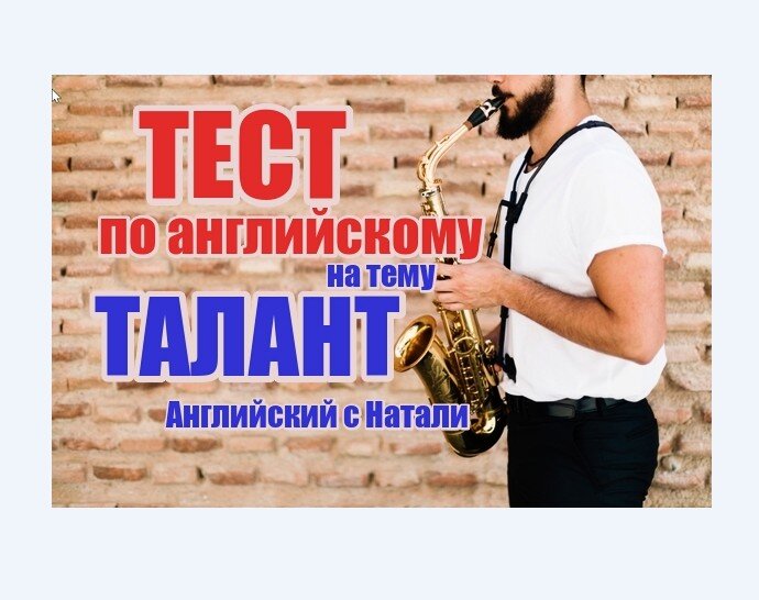 О талантах много говорят. А вы знаете слова в англоязычном варианте , такие как талантливый, выдающийся, успешный, потенциальный, навык, способности, уровень, блестящий и т. д? Именно на эту тему новый тест. После прохождения теста вы легко запомните слова, связанные с темой "Талант", а также обогатите свой словарный запас новыми оборотами с правильными предлогами по данной теме. Итак, начнем. Т Е С Т по английскому языку "Талант и все, что с этим связано" Т Е С Т Выберите один из вариантов ответа Не забывайте ставить "нравится" и подписываться на ценный и важный канал по изучению английского языка "Английский с Натали". Материалы с переводом слов из этого теста можно посмотреть в новой статье здесь. Не забывайте ставить "нравится" и подписываться на ценный и важный канал по изучению английского языка "Английский с Натали". До встречи! Наталья Валерьевна