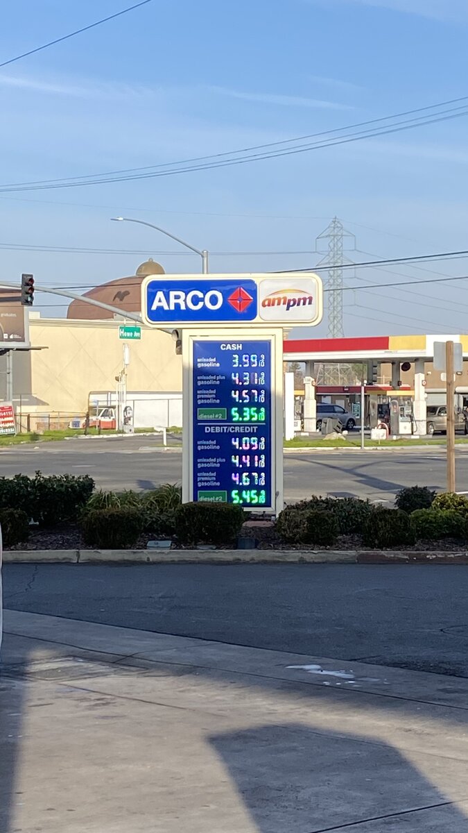 Перед поездкой на юг Калифорнии надо заправиться. Цена бензина в Сакраменто, январь 2023. Я заправляю в трачек 87 unlead (это не также же октановое число, как АИ-82 бы был в РФ) и стоит он 3.99$ за галлон, если платить наличными Спустя ~160 миль вниз (если смотреть по карте) цена на бензин растет в геометрической прогрессии. Заправка на трассе по пути в Лос-Анжелес, галлон того же бензина стоит 5.94$ за галлон! Вот это реально ужас Здесь одиночные заправки – редкость. Обычно это большой пятачок около трассы с несколькими брендами заправок и едальнями: макдоналЬдс, тако бэлл, старбакс и т.п. И, конечно же, пальмы А я делаю доставку попутного груза. Батарея для Toyota Prius из Сакраменто в ЛА А это прям-таки мувинг какой-то ;) Перевожу ребят из Сан-Диего в столицу Калифорнии на пикапе Dodge Dakota На обратном пути остановились передохнуть в ЛА. Вот такие грузоперевозки от Колюни и природа Калифорнии в феврале 2023 года Спасибо за чтение. Подпишитесь так же на мой youtube канал: https://