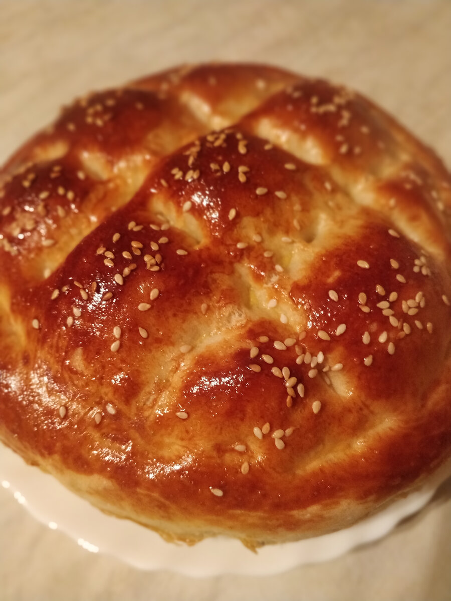 Ингредиенты. Приготовление. Соединяем все ингредиенты и замешиваем тесто. Кладём тесто в целофановый пакет и отправляем в тёплое место на 1 - 1,5 часа на расстойку. Когда тесто поднимется, собираем его в комок и перекладываем в форму для выпекания на пергаментную бумагу. Накрываем полотенцем и оставляем ещё на 30 минут. Потом смазываем сверху яичным желтком и прямо пальцами продавливаем тесто, придавая ему форму хлеба. Посыпаем кунжутом и отправляем в горячую духовку на 30 минут при t 180°C. Вынимаем из духовки, накрываем полотенцем и даём остыть. Всем приятного аппетита!
