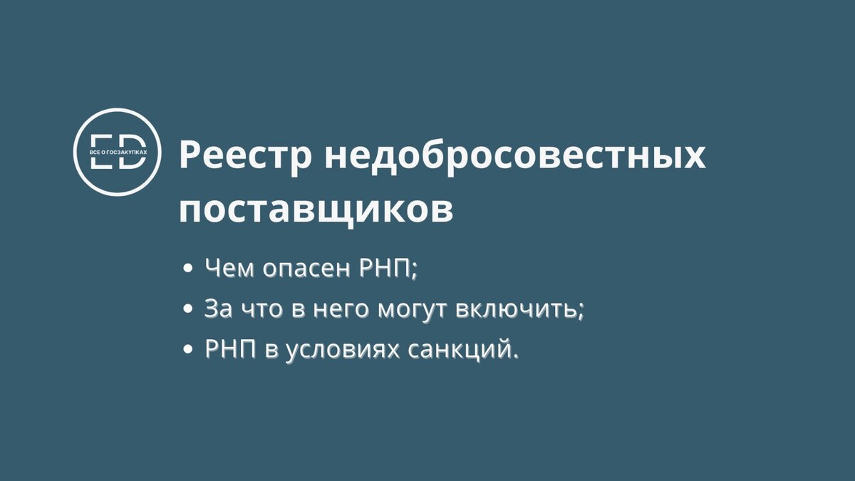Рассказываю, что такое Реестр недобросовестных поставщиков, за что заказчик может вас в него отправить и чем он опасен для организации. Чем опасен РНП? В первую очередь, реестр недобросовестных поставщиков опасен для поставщиков по следующим причинам: · Запрет на участие в торгах на 2 года по 44-ФЗ и 223-ФЗ. · Потеря обеспечения заявки, которое в большинстве случаев подлежит возврату. · Отсутствие права на обжалование действий заказчика по закупкам, если в тендере указано требование, чтобы поставщик отсутствовал в реестре. · Ущерб репутации. Реестр недобросовестных поставщиков – это индикатор недобросовестности компании, который может оттолкнуть от сотрудничества. Как поставщики оказываются в РНП Согласно 44-ФЗ, попасть в реестр можно по двум причинам: · Поставщик выиграл тендер, но уклонился от заключения контракта. Стоит обратить внимание, что если вы были единственным поставщиком в тендере, то вам придется заключать контракт в любом случае. · Поставщик заключил контракт, но наруши