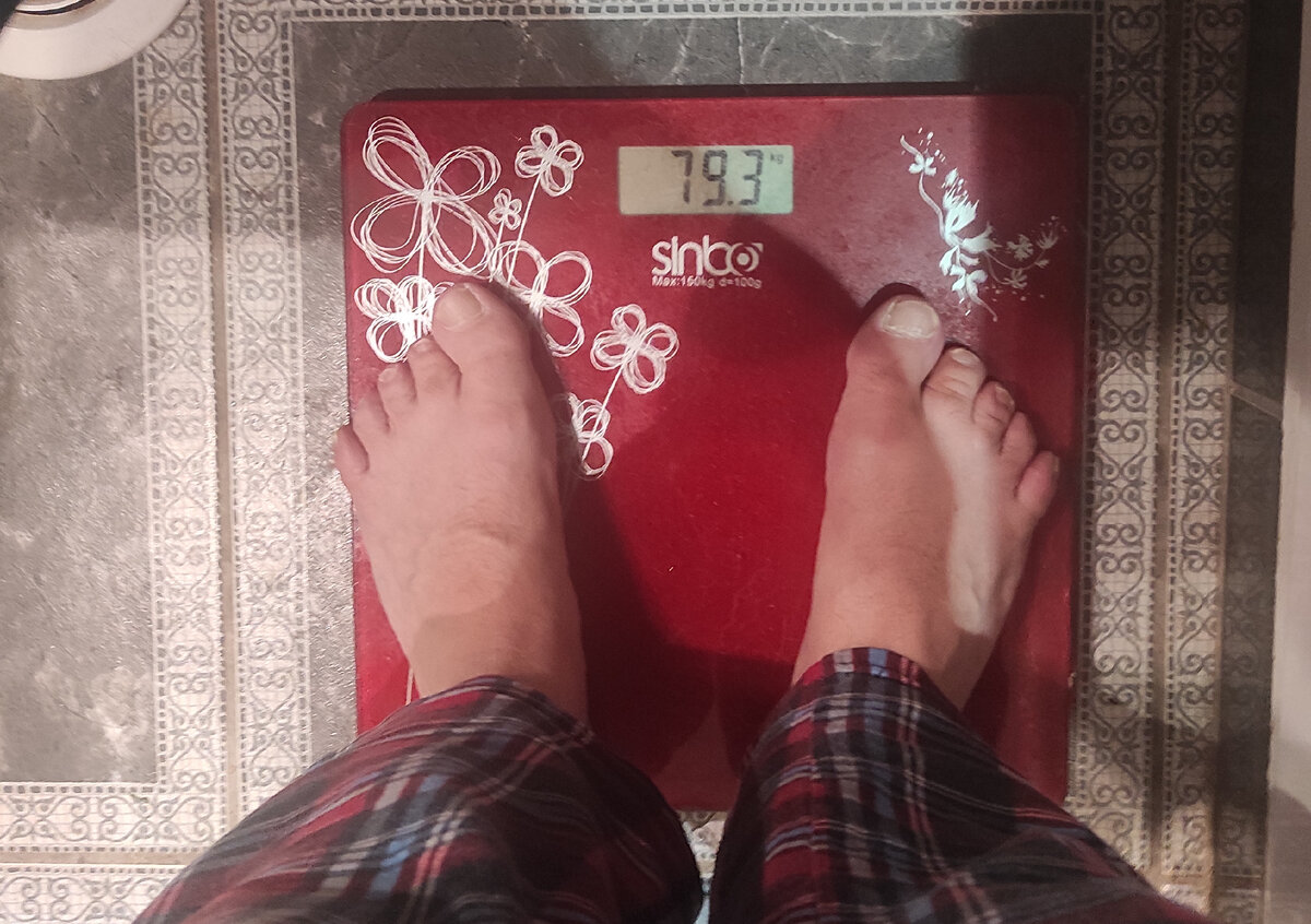 Ну вот, закончилась первая неделя "путешествия к лëгкости". Напоминаю, стартовала я с веса 82,1, а избавляюсь от излишков на сбалансированном рационе. Итог недели таков: Эта цифра повторилась на моих весах в субботу, воскресенье и сегодня. Нормально. Пока опыт пятилетней давности повторяется в точности. Тогда я перешла с 52 размера на 48. Честно говоря, в отличие от веса, на размер я нацеливаюсь. Но, желаемый 46 в рамках программы если и достижим, то только за счёт усиленных тренировок. Не буду "гнать лошадей", выполню стодневную программу, а там - посмотрим. Вчера страшно "развратничала" за праздничным столом Что было в рационе на прошедшей неделе. Много завтраков с омлетами (два яйца, молоко, овощи, зелень, иногда с добавкой сыра). Если честно, омлеты надоели, хочу сырников и оладушек. Скоро будут. Овощные супы, рыба с овощами, - на обед. Отварное мясо. Овсяная каша - пока, как еда перед сном. Дальше она появится в качестве первого или второго завтрака. Овсянку люблю цельнозерно