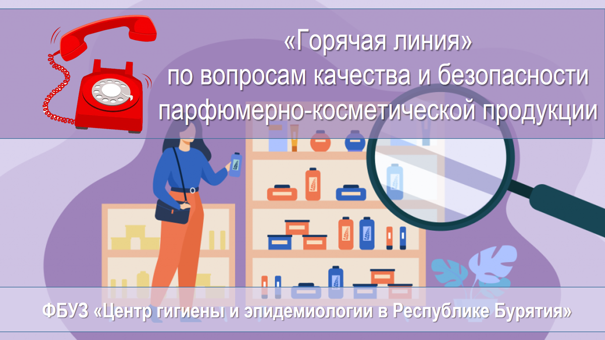 В период с 6 по 17 февраля 2023 года специалисты ФБУЗ «Центр гигиены и эпидемиологии в Республике Бурятия» проинфомируют население по вопросам качества и безопасности парфюмерно-косметической продукции. В этот период ФБУЗ «Центр гигиены и эпидемиологии в Республике Бурятия» проконсультируют потребителей о действующих в настоящий момент нормативных правовых актах, устанавливающих обязательные требования в отношении парфюмерно-косметической продукции. Также потребители смогут получить ответы на вопросы, связанные с маркировкой парфюмерно-косметических товаров, услышать практические рекомендации о том, как правильно выбрать такие товары в магазине (в том числе дистанционно), проинформируют о правилах их обмена и возврата в случаях, если товар оказался ненадлежащего качества. Для получения консультации от специалистов ФБУЗ «Центр гигиены и эпидемиологии в Республике Бурятия» можно обратиться по телефонам: Единого Консультационного Центра Роспотребнадзора 8 800 555 49 43 (круглосуточно, зв