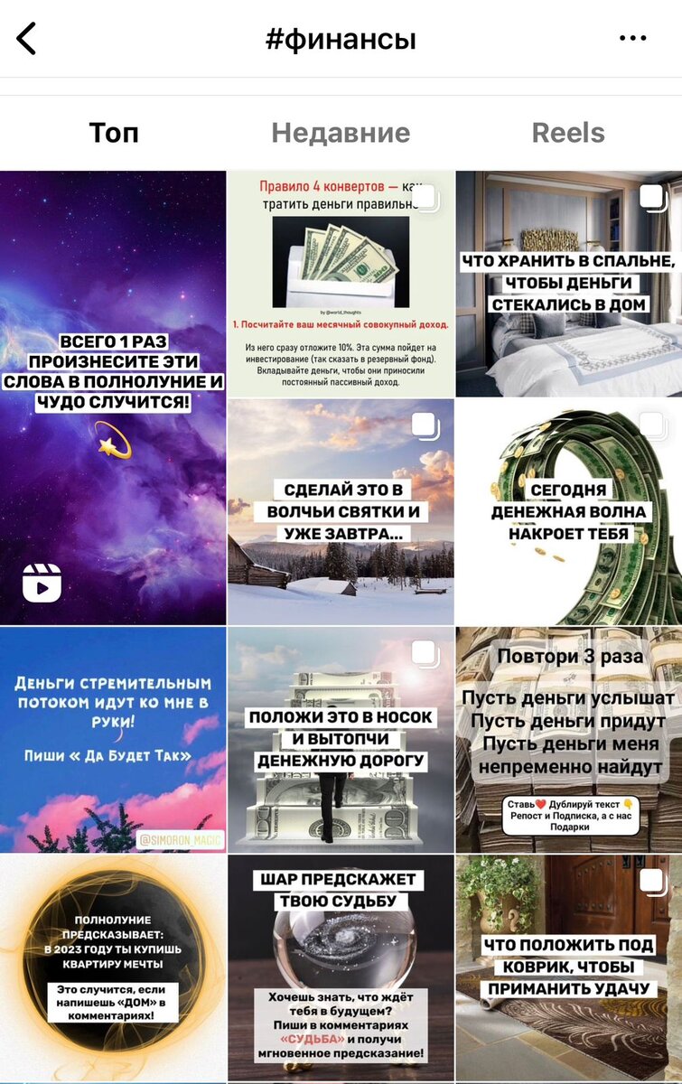 Вчера я набрал в поиске Инстаграма слово «финансы». И мягко говоря офигел от того контента, который на меня высыпался. Постов по теме запроса было максимум 25%. Примерно столько же было посвящено разного рода продвижению в социальной сети. Дальше по количеству шли посты про отношения. При чём посты от лица женщин про мужчин. Могу понять - у каждого свои источники финансирования. А следом…. Жесть! Мне показалось, что я оказался в сообществе языческих бездельников! Гороскопы, талисманы, обряды… Мне кажется, что ещё чуть-чуть и дойдут до жертвоприношений. Я почитал несколько постов. Интересно же! И я могу понять тех, кто их пишет. Они зарабатывают на людях, которые хотят сразу, много и ничего для этого не делать. Точнее нигде для этого не работать. Как я сказал, могу понять.