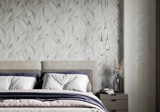 - Изящный мотив выполнен в технике витража. Рисунок покрывает пластичная сеть из перламутровых и серебряных прожилок. Они соединяют весь узор воедино, чтобы он выглядел на стене как бесшовное панно.