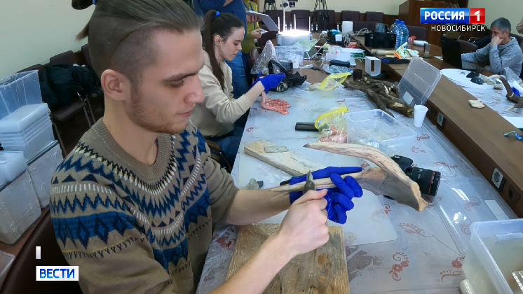 В музее Института археологии и этнографии ученые производят древние орудия труда ─ ножи, иглы, гарпуны. Археолог Дмитрий Гурулёв отвечает за первый этап, работает с неотесанными камнями. «Я делаю преформу ─ заготовку для нуклеуса, чтобы снимать микропластины, которые используют как режущие инструменты. Одного нуклеуса хватало на месяцы», ─ рассказал Дмитрий Гурулёв. В каменном веке нуклеус ─ самый ходовой материал. Привезли находку из Республики Алтай, где обнаружили следы предков сибиряков. Возможно, именно из этих камней и делали орудия труда древние люди. Они острые и прочные, при этом очень тонкие. Наши предки для изготовления орудий, пошива одежды, обработки камня, разделки мяса применяли разные технологии. Например, с помощью отжимника с роговым наконечником можно было откалывать пластины от обработанного камня ─ нуклеуса. Для этого его вставляли в специальный станок и со всей силы надавливали на отжимник. Орудия труда археологи проверяют в деле. Эксперименты проводят в сибирских