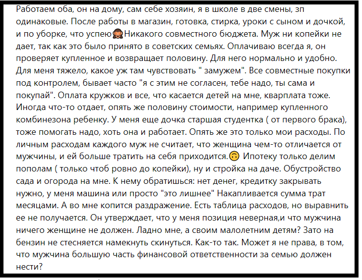 В этой статье я поднимала тему про раздельный бюджет. Сколько я не пыталась найти разъяснения по этому вопросу, ни один довод меня не убедил в том, что он должен быть раздельным, наоборот я все больше прихожу к выводу, что совместный бюджет это правильно, это нормально. (Для меня совместный бюджет- это когда люди все заработанное кладут в одно место и тратят сообща на нужды семьи) Подчеркну это мое мнение, я никому его не хочу навязать и не считаю, что противоположное мнение в корне не верно. В каждой семье все по разному, каждый делает, как удобно Под одной из статей появился вот такой грустный комментарий не знаю, какое подобрать правильное слово, что бы передать все эмоции которые он у меня вызвал С раздельным бюджетом у меня связанны именно такие ассоциации. Все так, как описано в статье, может поэтому я и не могу адекватно воспринимать это словосочетание. Когда я росла, у моих родителей была похожая ситуация. Мать свою зарплату тратила на нас, на свои нужды и на покупки для до