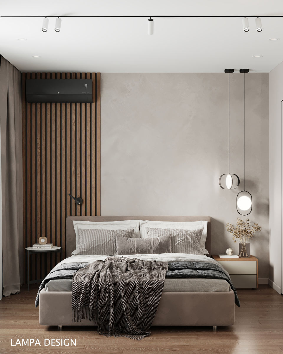 Спальня - одно из самых важных помещений в квартире. Пусть пространство и небольшое, но именно здесь мы заряжаемся энергией на целый день и отдыхаем от активных дел! В этой спальне, по пожеланиям заказчиков, мы постарались передать спокойствие за счёт природных оттенков. Пространство не насыщенно цветом, а акцентными деталями является дерево на стене и рельефная штукатурка на противоположной. В спальне предусмотрена небольшая гардеробная, чтобы, не выходя из комнаты, можно было комфортно собраться на выход. Обязательное дополнение к гардеробной - зеркало на противоположной стене от кровати. Деревянные элементы и зелёные растения максимально ассоциируются с лесными массивами, со спокойной расслабляющей атмосферой! В качестве освещения предусмотрели несколько вариантов: основное - трековые светильники с направленным светом, дополнительное - бра для чтения с одной стороны и регулируемые подвесные светильники с другой, которые также можно направить куда угодно. В целом проект полностью уд