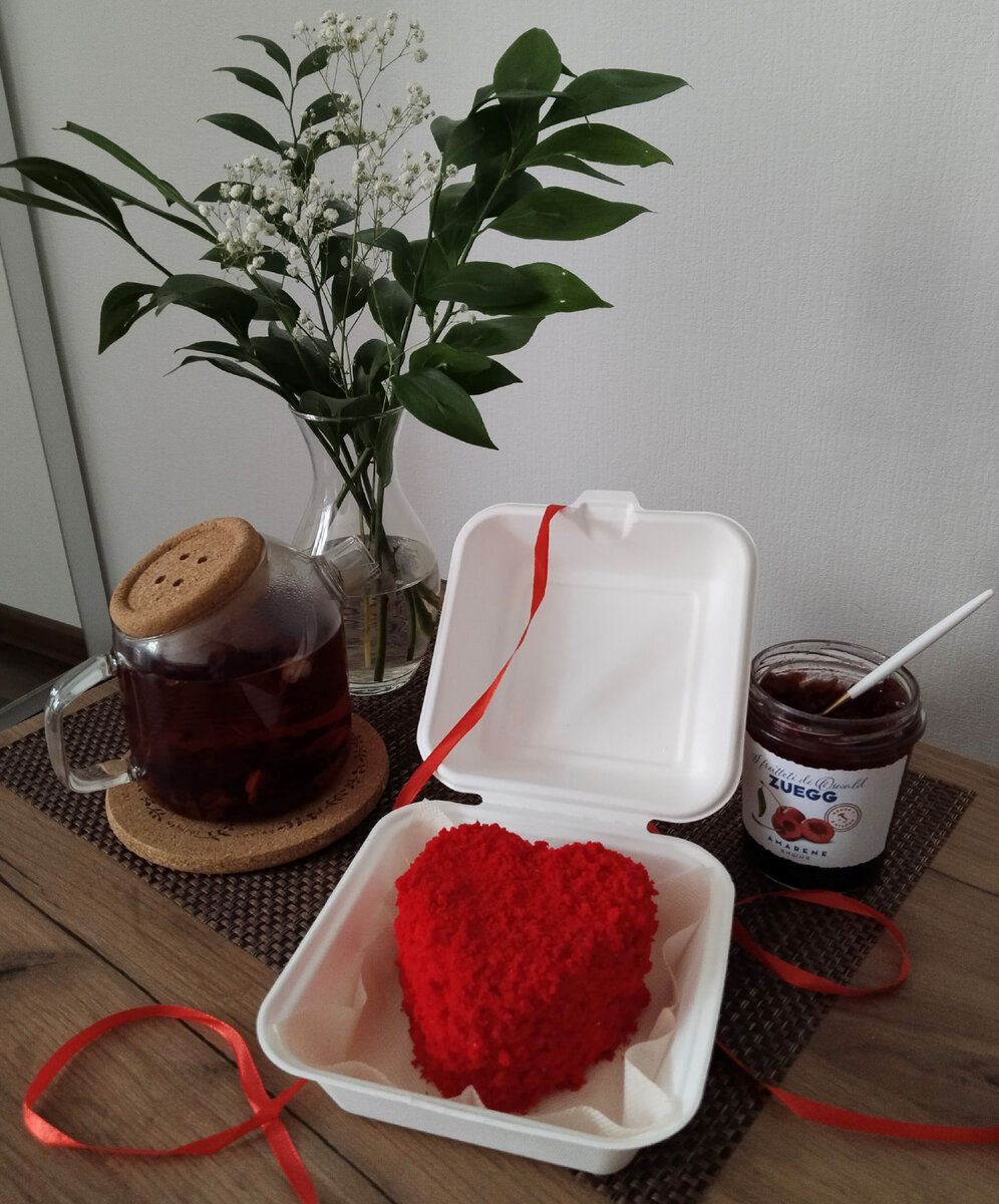 Собрать торт, выкладывая на каждый корж крем (в середину дополнительно положить варенье). Промазать кремом бока торта, выровнять. Раскрошить обрезки бисквита и посыпать торт со всех сторон. Поместить сердечко на квадрат пергамента и отправить в коробочку. Убрать в холодильник на пару часов.