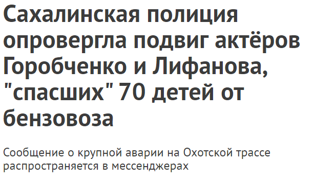 Горобченко и Лифанов помешали столкновению школьного автобуса с учениками спортивной школы с бензовозом частной компании. «Поравнявшись с бензовозом, Сергей Горобченко без всякой страховки смог перебраться в соседний автомобиль и заменить водителя», — сообщили в видео. В ГИБДД Сахалинской области опровергли этот фейк. Достоверность этой истории не удалось подтвердить и в интернете. Там нет информации ни о новом сериале, ни о том, что сами актеры посещали Сахалин. А еще, в ролике место, где якобы произошла история, назвали «Сахалинск», а не Сахалин. С 28 января видео с фейком на YouTube посмотрели около 400 тысяч человек, под роликом оставили 177 комментариев. ASTV.RU: Сахалинская полиция опровергла подвиг актеров Горобченко и Лифанова, «