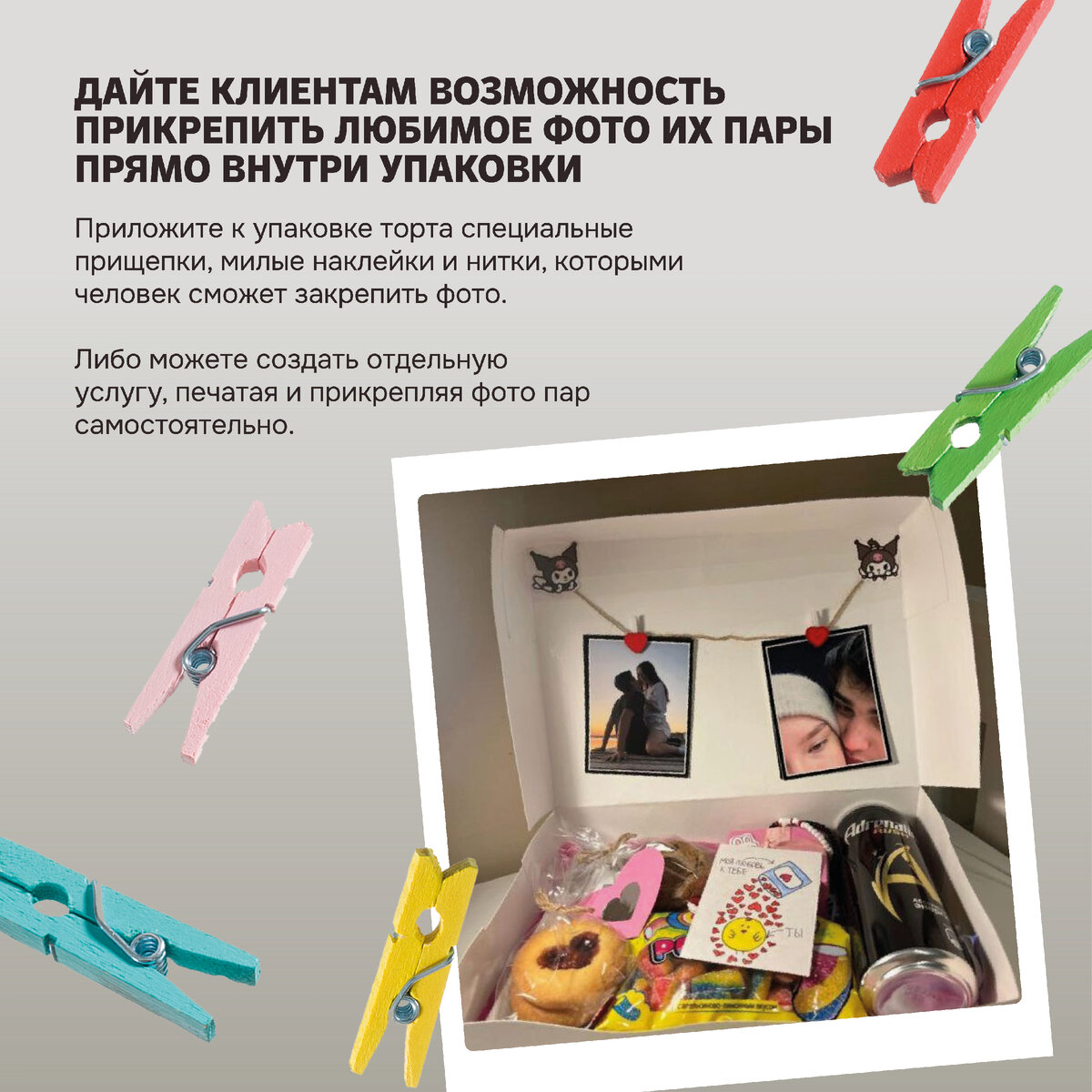 14 февраля – самый романтичный праздник в году. В этот день надо приложить в 2 раза больше усилий, чем обычно, чтобы порадовать свою вторую половинку и напомнить ей о любимых моментах в отношениях. И десерты нам в этом отлично помогут! 1. Дайте клиентам возможность прикрепить любимое фото их пары прямо внутри упаковки. Для этого приложите к упаковке торта специальные прищепки, милые наклейки и нитки, которыми человек сможет закрепить фото. Либо можете создать отдельную услугу, печатая и прикрепляя фото пар самостоятельно. Человек, который получит такой тортик, будет его есть с двойным наслаждением, ведь вы напомните ему о памятных романтичных моментах. 2. Прикрепляйте внутри упаковки с тортом открытки. Что писать внутри открытки? Например, можно в картинках и символах изобразить историю первого знакомства пары (которую клиент вам предварительно распишет). Людям нравится вспоминать об интересных или смешных моментах из прошлого – особенно если они перевернули их жизнь. 3. Добавьте на то