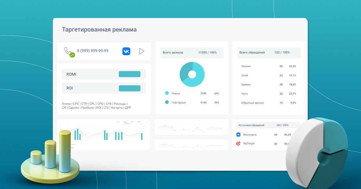 Рынок в 2022 году заставил всех понервничать и начать тестировать новые каналы. Все больше компаний более аккуратно подходят к размещению рекламы и более детально оценивают ее эффективность из-за сокращения бюджетов и незнания как продвигаться дальше. Зачем анализировать таргетированную рекламу? Анализ таргетированной рекламы в Calltrackoing.ru Теперь в Calltracking.ru появился новый отчет об эффективности таргетированной рекламы! Для социальных сетей ВКонтакте, и myTarget уже есть готовые интеграции. Настроить оперативную передачу информации напрямую в BI можно в несколько кликов. Данные по указанным параметрам будут обновляться автоматически. Отчет можно использовать для аналитики рекламных кампаний в ВКонтакте и myTarget, а также построить сквозную аналитику на основе данных из всех источников, в том числе контекстной и офлайн-рекламы. Отслеживайте все обращения в компанию: звонки, заявки, емейл и тд в 1 окне, а также оценивайте контекст не переключаясь между кабинетами. Отчет о тар