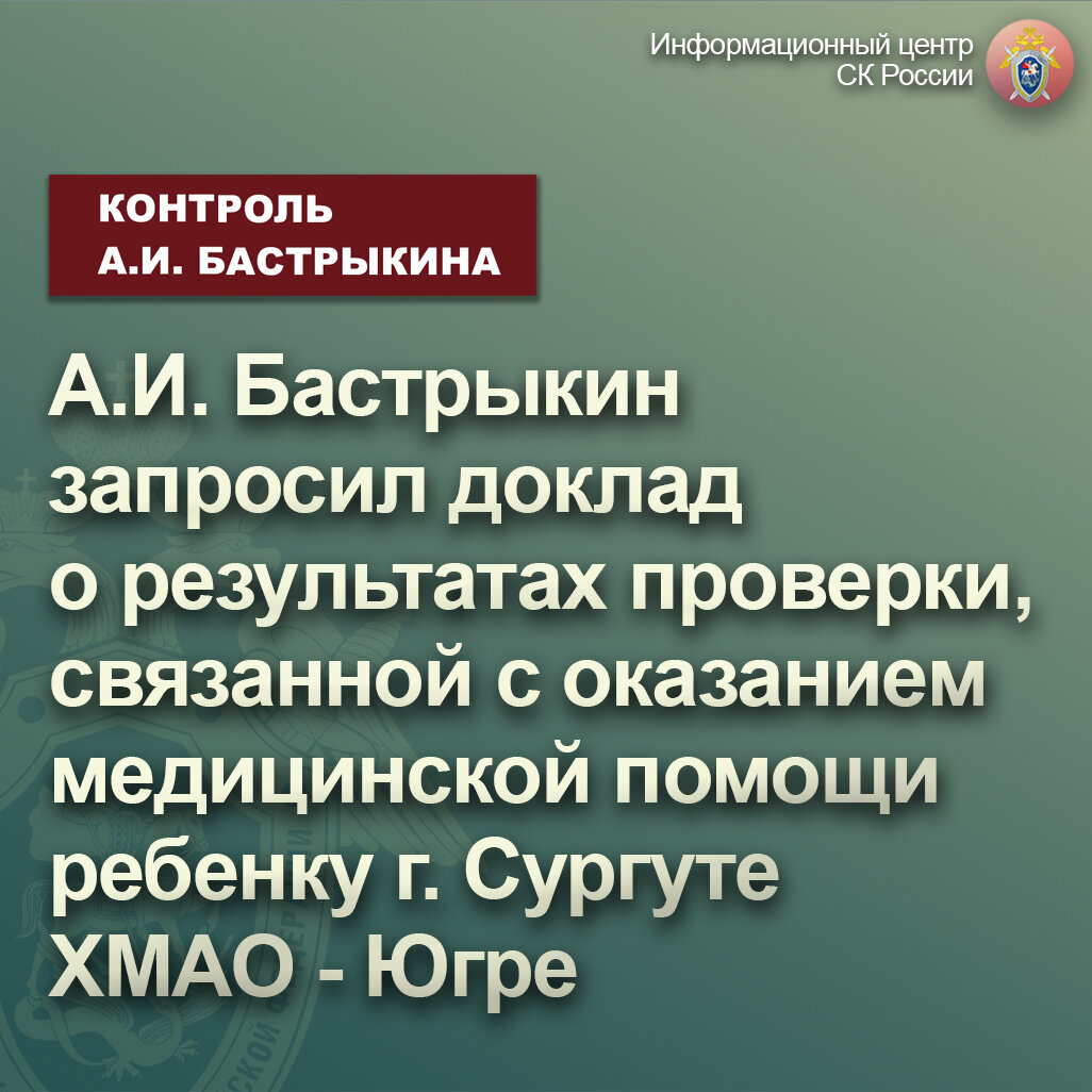 Председатель Следственного комитета Российской Федерации Александр Иванович Бастрыкин поручил и.о. руководителя СУ СК России по Ханты-Мансийскому автономному округу - Югре Дмитрию Викторовичу Шерману представить доклад о проведенных проверочных мероприятиях и принятом по результатам процессуальной проверки решении.