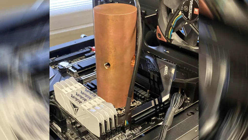 TDU поделился несколькими фактами и цифрами о своей эскападе по охлаждению массивного цилиндра из меди, благодаря чему этот самодельный пассивный вариант кажется почти практичным. В течение короткой вычислительной сессии процессор Intel Core i9 (модель не раскрывается) полностью пассивно охлаждался медным блоком. На фотографии ниже видно, что во время тестирования система ПК находилась полностью под открытым небом. Во время тестирования процессор TDU работал на холостом ходу при температуре 35 градусов Цельсия, но температура поднялась до 80 градусов Цельсия после выполнения бенчмарка и стресс-теста, который длился менее минуты. Самым впечатляющим показателем, вероят