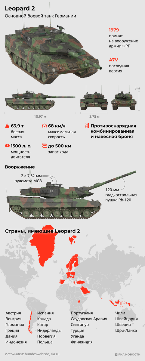 Канада и восемь европейских стран анонсировали передачу Украине танков Leopard 2. Базовый вариант этой боевой машины был создан в конце 1970-х годов. С тех пор "Леопард" претерпел множество изменений и стал вторым по массовости танком НАТО. Союзники обещали поставить Киеву более 200 экземпляров разных модификаций. Главные тактико-технические характеристики Leopard 2 и страны, у которых он стоит на вооружении, — в инфографике Ria.ru.