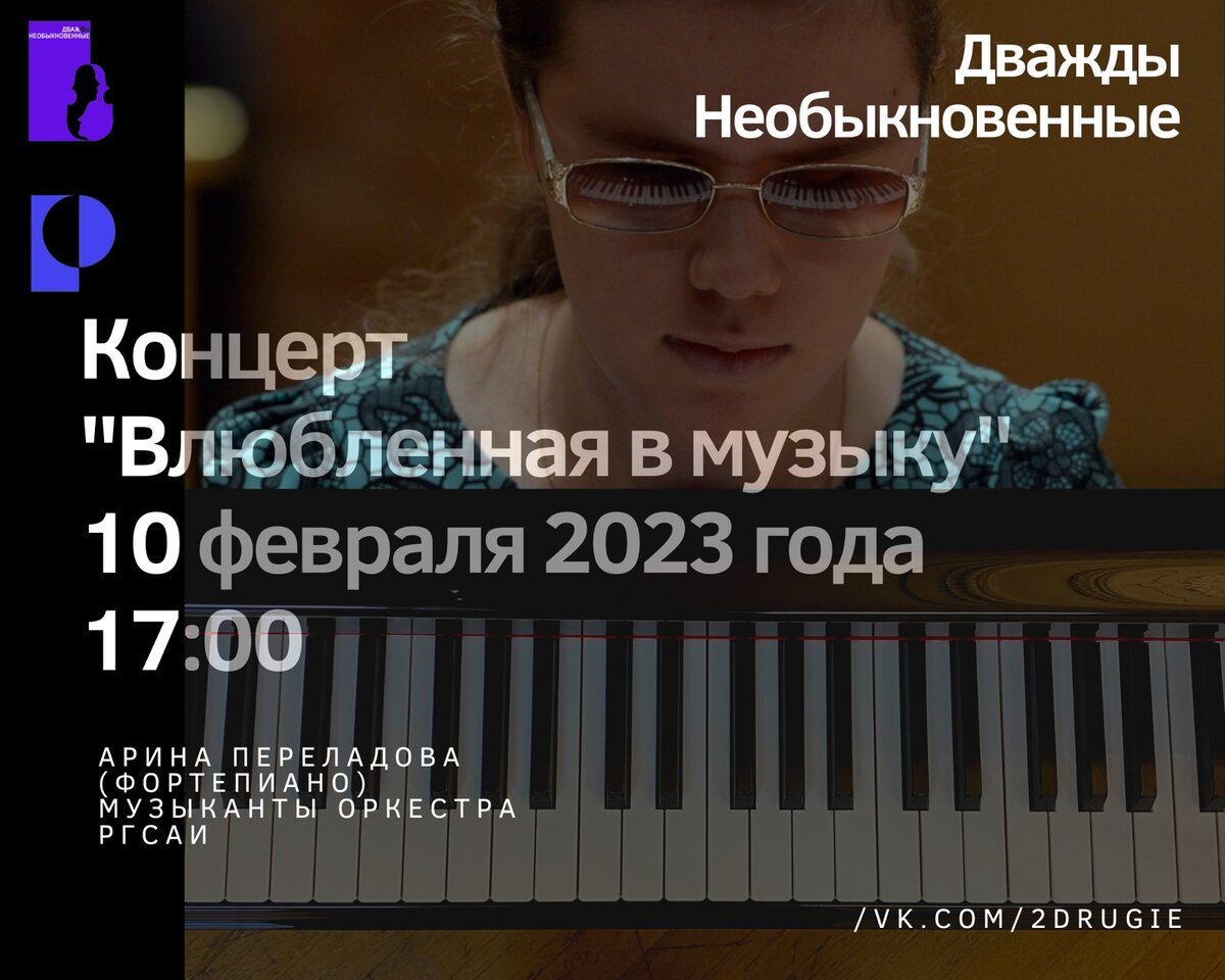 10 февраля 2023 года в 17:00 в Зеленом зале РГСАИ состоится второй концерт проекта «Дважды необыкновенные» под названием «Влюбленная в музыку». Солистка – студентка музыкального факультета РГСAИ Аринa Переладовa, талантливая пианистка, которая не видит с детства. Арина родилась в Красноярске, окончила специализированную музыкальную школу для слепых и слабовидящих детей в городе Армавире (Краснодарский край). Она изучает ноты на ощупь, с помощью шрифта Брайля, и чтобы освоить новое произведение, ей нужно проводить за роялем куда больше времени, чем обычному пианисту. Но уже сейчас ее педагог, декан музыкального факультета РГСАИ Юлия Павловна Антонова сравнивает уровень сложности, с которым справляется Арина, со спортивными элементами «ультра си». Сама же Арина говорит о своих успехах так: «Делюсь секретом великого музыканта: 6 дней ты трудишься, а на седьмой играешь, играешь, и еще раз играешь». Такая любовь к музыке уже щедро вознаграждена - Арина выступала с народным артистом России Д