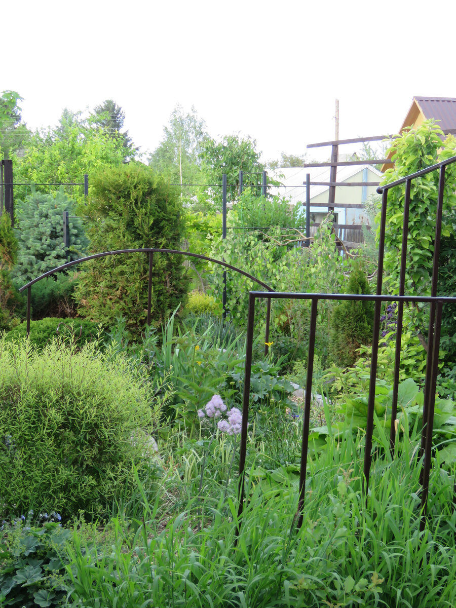 Какой нормальный🤣 садовод заказывает опору от кутюр для злака у кузнеца? Я. Я заказываю. Патамушта этот злак люблю любовью сильной, а колышки он, заматерев, ломает и, под напором ветра и дождя, радостно всю свою массу укладывает на соседей. (ой, не вейник, не вейник). Опору видим на переднем крае? А злак не видим. Правильно. Ибо этот товарищ играет в интереснейшую садовую игру "черт из табакерки": в мае ничего нет, а в конце августа почти 3 метра красоты.. Да, это мискантус гигантский. Ибо только он живет у нас сносно (брательники его роду китайского мерзнут. А роду сахароцветкового - агрессивничают). Отрастает поздно, нарастает не особо шустро. Да, делим его под лозунгом :"лопату сломали, копающий материт тебя словами добрыми🤣", потому, кто его жаждет - копает сам. Но зато осенью это ж все шуршит и колышится, где-то там в высоте. И ровненько стоит😁, ибо привязан теперь (хотя опору надо цементировать, чем и займемся, а то и ее пытается под своим весом вывернуть привязанный это