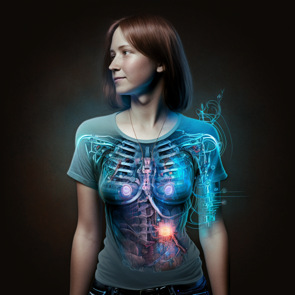 Женщина, одетая в футболку и джинсы, имеет биомеханическую руку и ногу с мышцами, светящиеся диоды и микросхемы в качестве замены ампутированной руки и синих светящихся диодов на голове, с медицинской и технической точки зрения очень детальный вид.