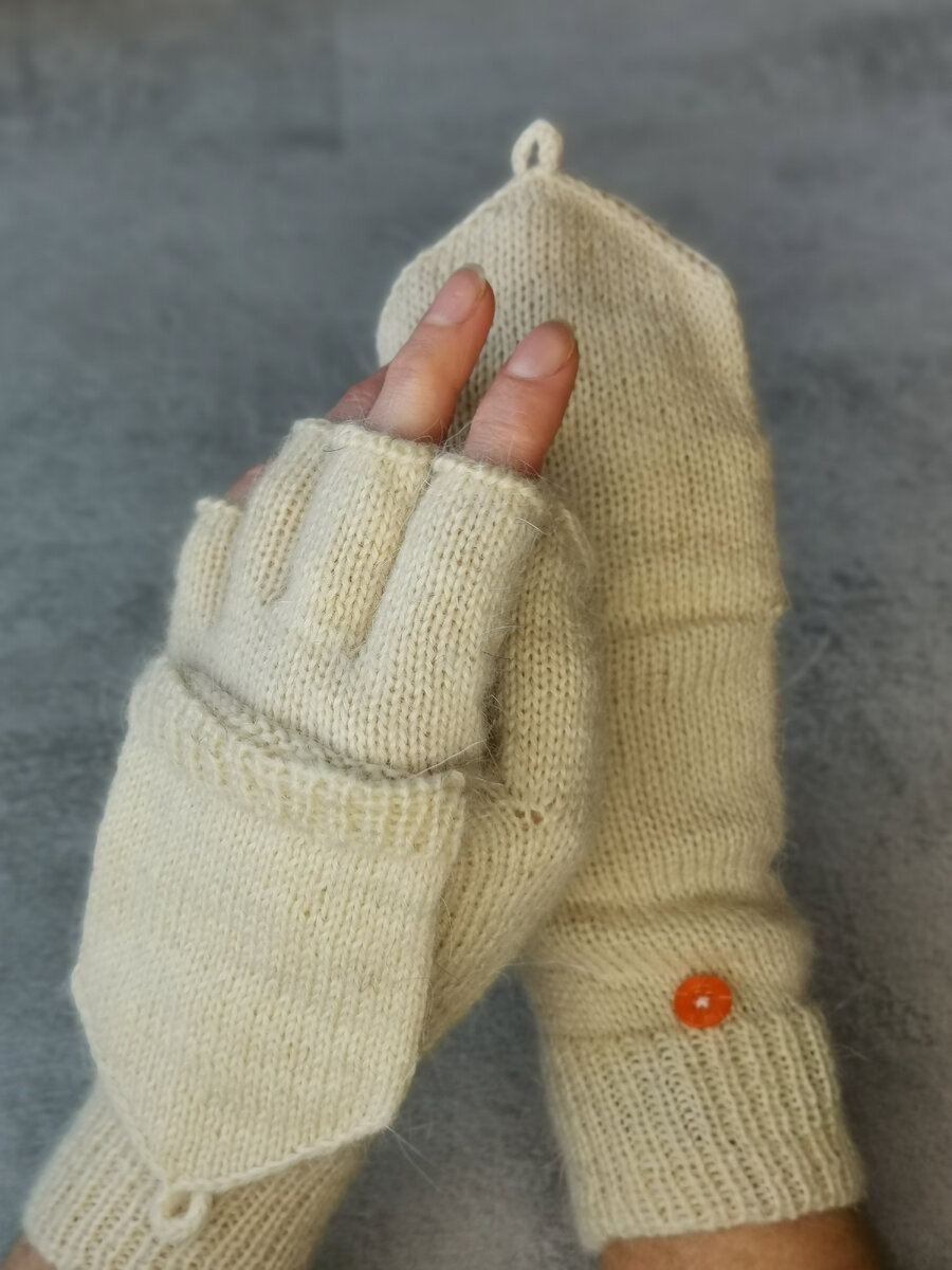 Обычно такие вещи вяжут осенью, но мне они понадобились в середине зимы. Я расскажу, как я их вязала для себя, а если нужен другой размер, то каждый может пересчитать. Для начала измеряется окружность кисти. Кладем кисть руки на стол и измеряем сантиметровой лентой. Важно кисть держать в расслабленном состоянии и не туго натягивать сантиметр. Переводим сантиметры в петли. У меня получилось 54 петли. Пришлось добавить еще две, чтобы удобнее было распределять потом на каждый палец. Получилось по 28 петель на каждую половину митенки. Первые 28 петель образуют внутреннюю сторону, другие 28 п. - внешнюю сторону митенки. Итак, 56 петель набираем на спицы № 2,5 итальянским набором, замыкаем в кольцо и вяжем 20 рядов резинкой 1х1. Затем переходим на спицы № 3 и вяжем 10 рядов лицевой гладью. Теперь начинаем вязать клин для большого пальца: петля из протяжки, лицевая петля, петля из протяжки (для правой руки) и далее без изменений до конца ряда. Для левой руки прибавки клина делать таким же спо