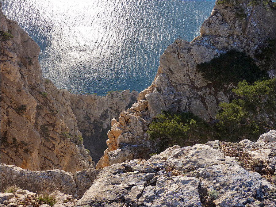Очередная стайка брошенных на полянке рюкзаков уже не удивляет — скорее радует. Верный признак — путь к Айя мы одолели… Дорога выводит от поляны вверх. Распахивается простор — синий, аж до рыжего в солнечных лучах Фиолента. И скалы под умопомрачительным обрывом — с зависающими на каменных спинах соснами…