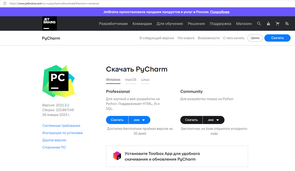 Ну что начнем наш путь в IT, переходим по следующей ссылке(тык: Скачать PyCharm: IDE для профессиональной разработки на Python от JetBrains). Должна открыться следующая страница: