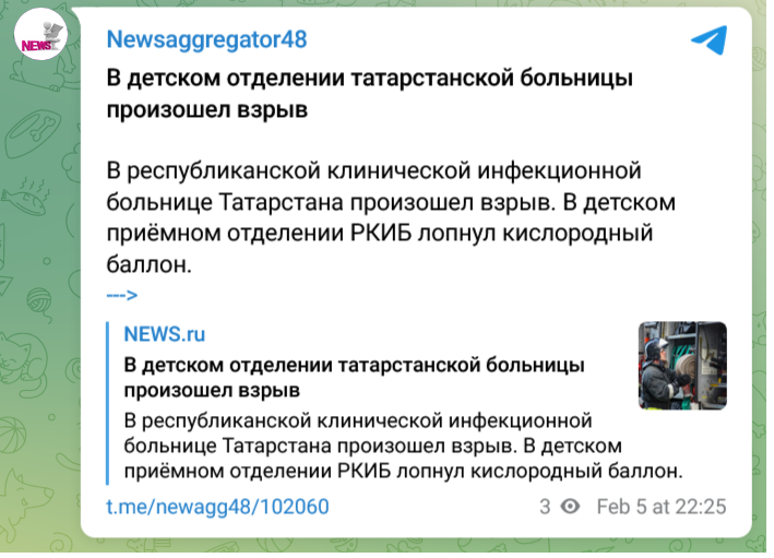 В Татарстане в детском отделении Республиканской клинической инфекционной больнице (РКИБ) произошел взрыв газа из-за разгерметизации газового баллона — такая новость распространилась в местных сообществах в сети. Якобы сотрудники эвакуировали пациентов и персонал, а на месте работали пожарные. В РКИБ опровергли новость о взрыве. В больнице объяснили, что в больнице проводили опрессовку кислородных труб, которые были даже не подключены к системе снабжения кислородом. Как сообщили в ГУ МЧС России по Республике Татарстан, во время ремонтных работ одна из заглушек вылетела и спровоцировала громкий звук. На всякий случай обратились в экстренные службы. В больнице подчеркнули, что пострадавших нет. Татар-информ: В РКИБ назвали фейком информацию о взрыве газа