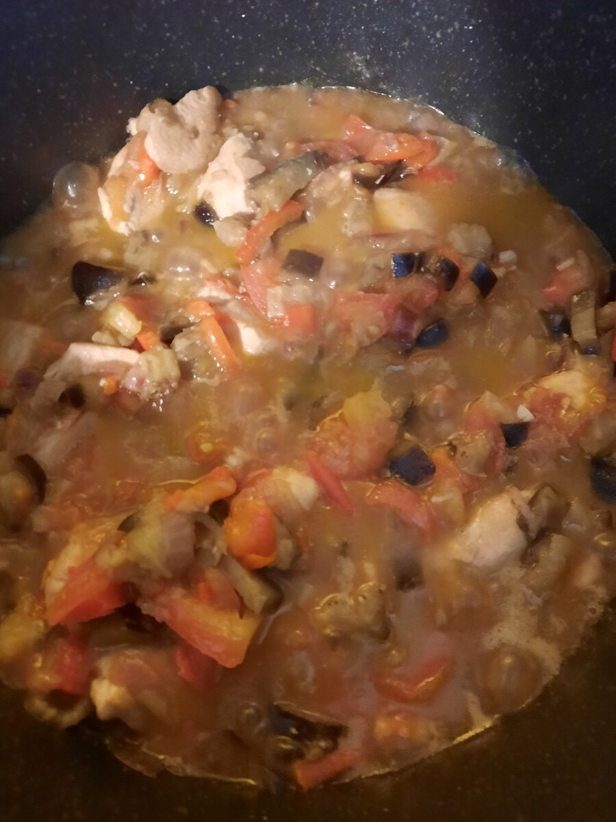 Это достаточно калорийное блюдо, но его преимущество в том, что его может с удовольствием есть вся семья. При этом в составе нет ни одного продукта с гликемическим индексом больше 30. На 100гр продукта: Готовится рагу в чугунке не меньше 4-5 литров. Для семейного ужина понадобится: Масло залить в чугунок и поставить на сильный огонь. Можно класть меньше масла, но тогда вкус курятины будет хуже. Бросить курятину в разогретое масло и готовить на сильном огне, помешивая, пока на мясе не появятся золотистые пятнышки. Убавить огонь до небольшого. Высыпать нарезанный соломкой лук и сельдерей. Слегка посолить и поперчить. Нарезать баклажаны, бросить в них щепотку соли, перемешать и отложить в сторону. Помидоры тоже нарезать соломкой, в них добавить мелко нарезанный чеснок и тоже отложить в сторону. Не забывать помешивать рагу в чугунке. Когда лук станет полупрозрачным, закинуть болгарский перец. (Я использовала обычный и красный лук, на самом деле для этого блюда нет разницы). Когда перец