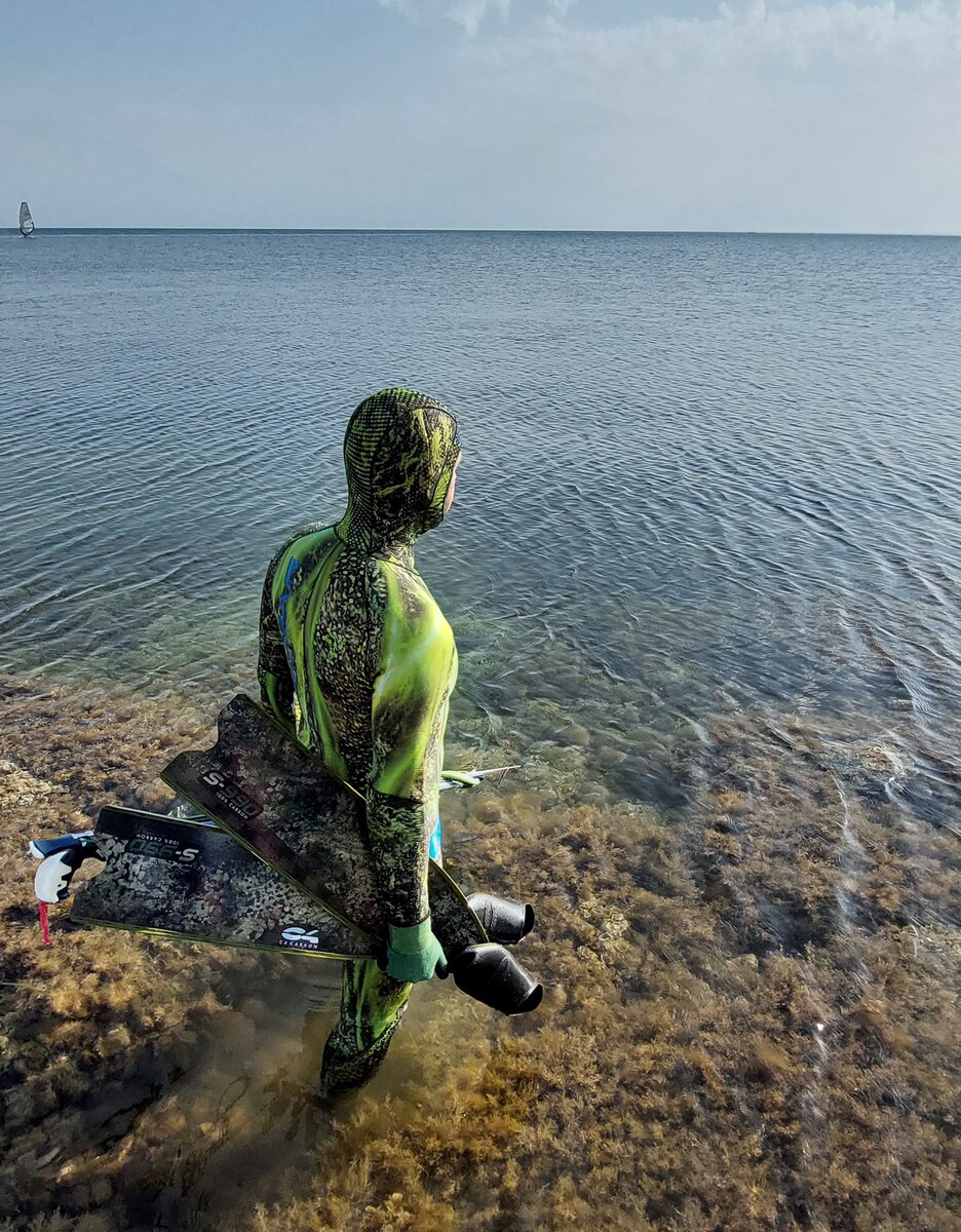 И так поплыли. Первые десятки метров передвижения по поверхности подсказывали, что грести мне через чур легко. Я практически не ощущал нагрузку на мышцы ног. Решил заплыть подальше на глубину, чтобы уже в нырке проверить тяговитость лопастей. Нырок, второй, потом третий и я окончательно убедился, что 25я жесткость не мое. Ласты S-990 CAMU 25 - это тот же самый карбон, что и DUAL MOON HT 25, владельцем которых я являюсь. Так вот, в новинке 25й жесткости мне не хватало мощности. В то время как DUAL MOON HT 25 уверенно поднимают меня с глубины. В новинке ощущалась вязкость, мне не хватало энергии. И причиной такой мягкости явилось отсутствие усов у ласт C4 S-990 CAMU. Также нельзя не учитывать и тот факт, что лопасть здесь крепится к стопе. Это тоже играет свою роль. А регулировать смысла не было, так как изначально я установил ее с максимальным выносом. Для моих потребностей нужны более жесткие лопасти. Неделя ожидания и я уже устанавливаю лопасти 30й жесткости C4 S-990 CAMU в калоши 200 серии. И вот первый нырок, проход вдоль дна, залежка, старт с места и уверенный подъем наверх. Вот, это уже другое дело - говорил я сам себе - на эти крылья я могу положиться. И пошли своим чередом охота за охотой, с тысячеметровыми заплывами и погружениями на десятки метров.