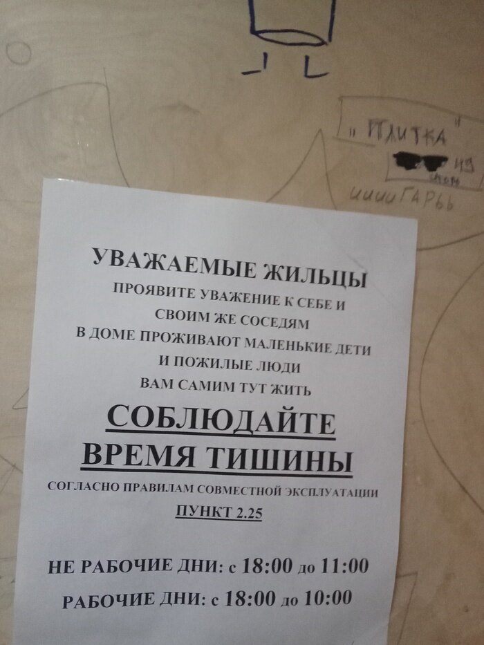 Всем привет! Спасибо дорогим читателям, что на меня подписались! Сегодня будет пару историй прям свеженьких и о наболевшем. А, именно, о Графике работы и моей боли. без длинных предисловий начнём: История первая (с пылу, с жару. Сегодняшняя). Приезжаем с напарником на адрес. Дом 30 этажей, один подъезд. Заходим в парадную с инструментом, а в холле на встречу нам из лифта девушка. - Девять утра, а они уже тут. Вы в курсе, что работать можно с 10-ти? Я, хотел было возмутиться, но подумал, ч то портить настроение с утра не стоит. Так что мы с напарником молча прошуршали мимо этой дамы в сторону лифта, а она отправилась к выходу. Закинули инструмент в лифт, и поехали. Пока это чудо лифтостроения добиралось до 9-го этажа, я читал что написано на стенах, и самое главное было вот это: Интересная фигня выходит, ведь в нашей маленькой Карелии нет никаких особенных поправок к "Закону о тишине", в отличии от Москвы или других регионов. у нас всё чётко: https://zakonotishine.ru/kareliya/ Это ссылк