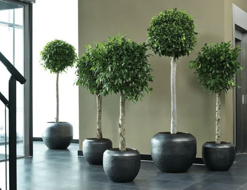 Самое универсальное и популярное растение - фикус. Фикусы очень любят дизайнеры интерьеров за их раскидистую крону, необычайно красивую расцветку листьев и сдержанную элегантность. Они способны вписываться в любой стиль: классика, барокко, экостиль, восточный и др. Учитывая, что многие приметы связывают фикус с материальным достатком, в офисе этот цветок также придется к месту. К нам обратился клиент, офис которого уже был оформлен фитодизайнерами. Но со временем изменилась планировка, холл и коридоры стали выглядеть пустыми и неуютными. Перед нами встала задача подобрать растения, которым не нужен тщательный уход, не боятся перепадов температуры и не требовательны к освещению. Наш выбор пал на фикус, он помогает создать спокойную уютную атмосферу, отлично сочетается с другими растениями и легко вписывается в деловую обстановку. Так как сок некоторых сортов фикуса ядовитый и за ними нужно тщательно ухаживать, мы выбрали искусственный фикус. Он точная ботаническая копия, отвечающая всем