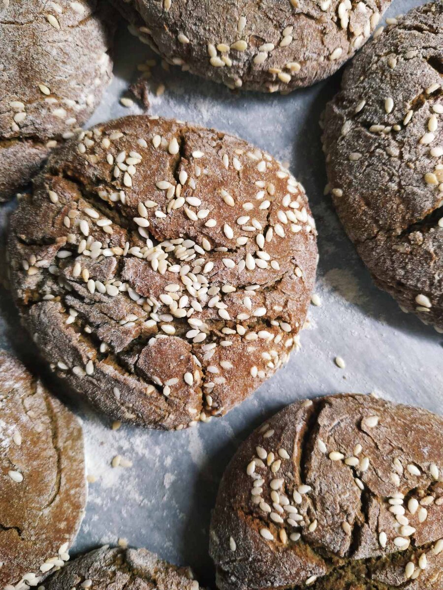 После выстаивания теста в холодильнике начинаю лепить лепешки, обваливая из сначала в рисовой муке, а потом в кунжутных семенах. Если Ваше тесто будет слишком мягким для лепки, добавьте немного небольшое количество муки. Семена также можно слегка добавить и в само тесто перед лепкой. Пергаментную бумагу присыпаю мукой и выкладываю лепешки. Из данного в начале объема ингредиентов у меня вышло 12 крупных лепешек - 1 полный противень. Ставлю в духовку, разогретую до 180 градусов примерно на 20-25 минут. Время выбирайте самостоятельно, смотрите по зарумяниванию корочки, так как духовки у всех разные. Сверху обычно делаю небольшие надрезы теста. После выпекания лепешкам лучше постоять еще минут 15 на открытом воздухе, остыть. Потом убираю в закрытую емкость. Приятного аппетита!