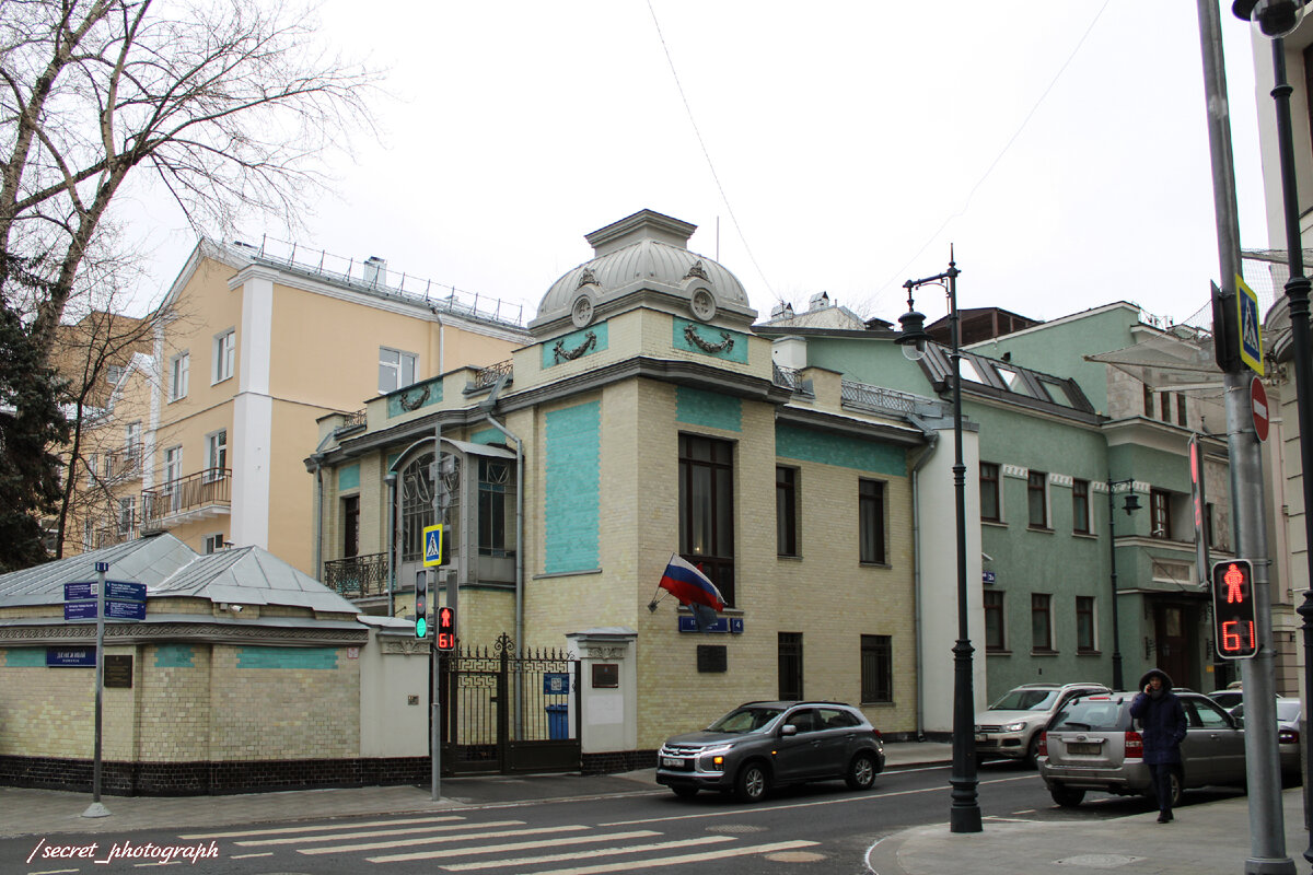 Этот особняк стоит прямо на красной линии Денежного переулка, в отличие от спрятавшегося от глаз Кекушевского дома Листа. И мимо него я не смог бы пройти при всем своем желании! Эта бирюзовая керамическая облицовка, лепнина и небольшой четырехгранный купол – как будто цветочную вазу перевернули и ею увенчали здание – привлекают внимание с первого взгляда (6 фото).