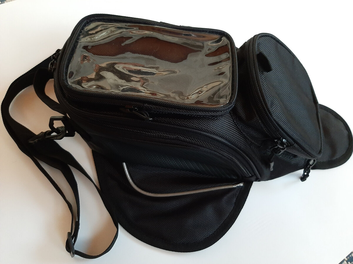 Не могу сказать, купил бы я сам такой девайс или нет. Но факт есть факт – мне подарили «Сумку на топливный бак мотоцикла с креплением на магнитах». Внимательно разглядев сей смятый при транспортировке предмет неизвестного производителя, пришел к следующим выводам. Сначала отрицательные: 1. Сумка совершенно не держит форму. Если ее, конечно, специально не набить чем-нибудь. Как будет держаться смартфон в ее верхнем отделении – не понятно, под собственной тяжестью он сумку сминает, экран смотрит не на райдера, а куда-то вбок; 2. Сумка не фиксируется магнитами на топливном баке. Магниты - полный хлам: тоненькие, слабенькие. Ничего они не держат. Теперь о положительных сторонах, коих оказалось много: 1. Идея сама по себе хороша. Сумка удобная, небольшого объема, но достаточного, чтобы не рассовывать перед поездкой мелкие необходимые предметы по карманам. Магниты обеспечивают легкость установки и быстросъемность, можно быстро забрать сумку с собой; 2. На сумке несколько карманов. Больш