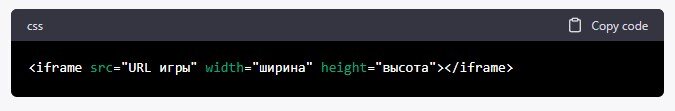Чтобы вставить iframe игры на страницу своего сайта, вы можете использовать HTML-тег <iframe>. Синтаксис: Например: Обратите внимание, что URL игры должен быть доступен для вставки в iframe.