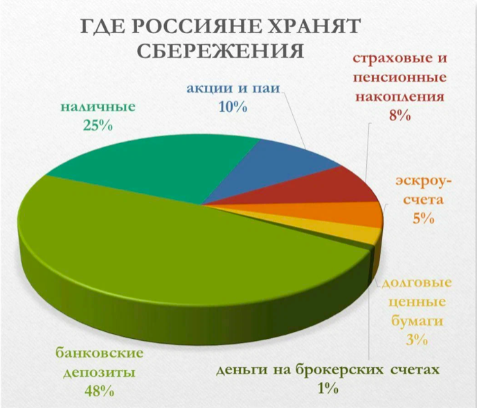 1% — средства на брокерских счетах На фондовый рынок ушло всего лишь 13%, сюда мы относим суммарно долговые ценные бумаги, акции и паи. Какой из этого можно сделать вывод? 👉🏻 Вклады и наличные деньги по-прежнему остаются в ТОПе. А значит инфляция продолжает поедать накопленное при минимальном приросте 🤷🏻♀️ К слову сказать, размер официальной инфляции нынче составляет - 11,9%. Поэтому считайте сами 😌 А где вы предпочитаете хранить деньги?