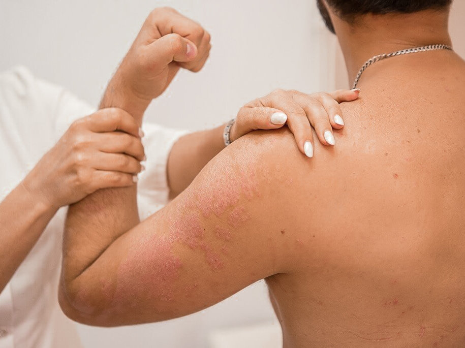 Обычно псориаз проявляется образованием красных, чрезмерно сухих, приподнятых над поверхностью кожи пятен — так называемых папул, которые сливаются между собой, образуя бляшки.