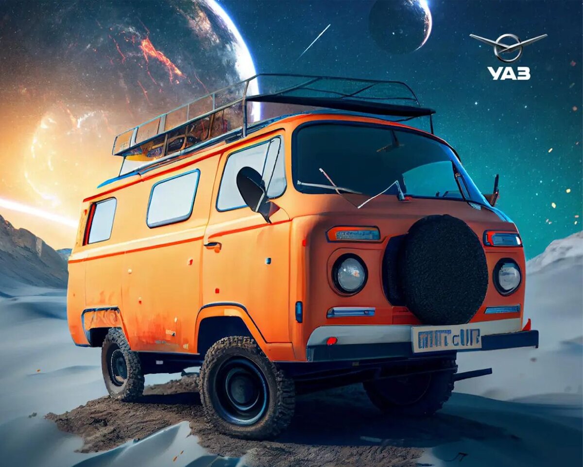 Нейросеть выдала оранжевый фургон, очень похожий на экспедиционную спецверсию уазовской "буханки". С серийной продукцией "УАЗа" машину роднит форма дверного проема, конфигурация шасси и колесных арок.