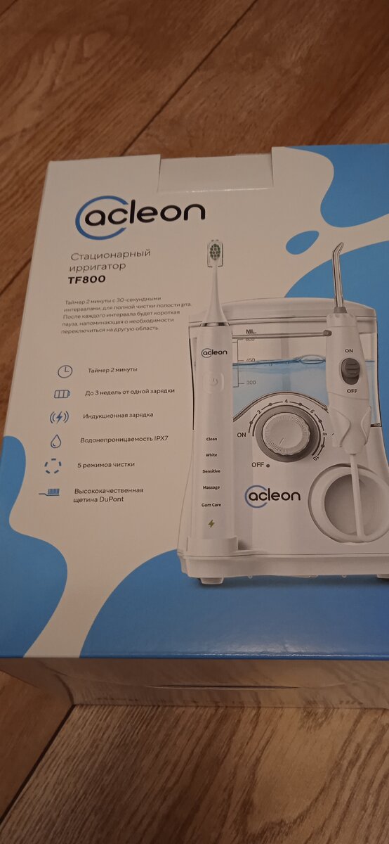 Видио на Зубной центр Acleon TF800 Пожалуй в настоящее время нашу жизнь очень сложно представить без электрощетки и ирригатора и эти вещи плотно вошли в нашу каждодневную жизнь и перед очисткой зубов или после зубной щеткой мы обязательно используем ирригатор. Но в этом отзыве речь пойдёт о целой зубной станции которая объединяет в себе сразу два теперь уже нужных приборов это аккумуляторная щётка и ирригатор, то есть два в одном. По функционалу в данной станции всё есть. 7 съемных насадок для ирригатора и 4 для щётки. Уровень давления струю от 200 и до 850 кПа, регулируется на панели. А щётка имеет 5 режимов работы: массаж, уход за дёснами, чистка, отбеливания и для чувствительных зубов. Автономность щётки без зарядки равняется 3 недели, далее щётка заряжается на платформе зубной станции. Гарантия на станцию один год. Есть подробная инструкция. Так выглядит щётка. А так она работает По дизайну щетка очень красивая и комфортная в руке. Кнопка включения тоже очень удобная и не маленьк