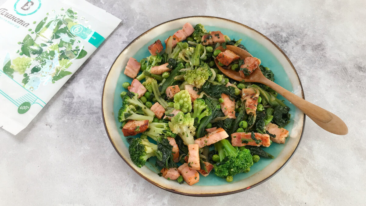 Зелёные овощи с грудинкой. Полноценный ужин за 10 минут: ароматный, питательный и вкусный👌 Выход 700 г Кбжу на 100 г 126/6/10/4 Видеорецепт ждёт вас внизу страницы ⤵️ Ингредиенты: Лук репчатый 1шт Грудинка варёно-копченая 200 г Смесь замороженных овощей "Планета витаминов" "Грин Фит"(шпинат листовой , зеленый горошек , брокколи , капуста романеско) 400 г Чеснок 1 зубчик Петрушка 2 веточки Соль, перец по вкусу Подписывайтесь на наш канал- вас ждут простые проверенные рецепты салатов, горячих и холодных блюд, множество десертов и закусок каждый день в разных форматах! Выбирайте удобный для вас. Мы в Телеграм, вконтакте, Instagram* и Facebook* Где купить товары "Планета Витаминов"? Рецепт: 1. Лук нарежьте перьями. Грудинку нарежьте крупными кубиками. 2. На холодную сковороду выложите нарезанные лук и грудинку и обжарьте, помешивая 5 мин до золотистого цвета грудинки. 3. Добавьте чеснок, пропущенный через пресс. Добавьте смесь "Грин фит" (не размораживая), перемешайте, готовьте