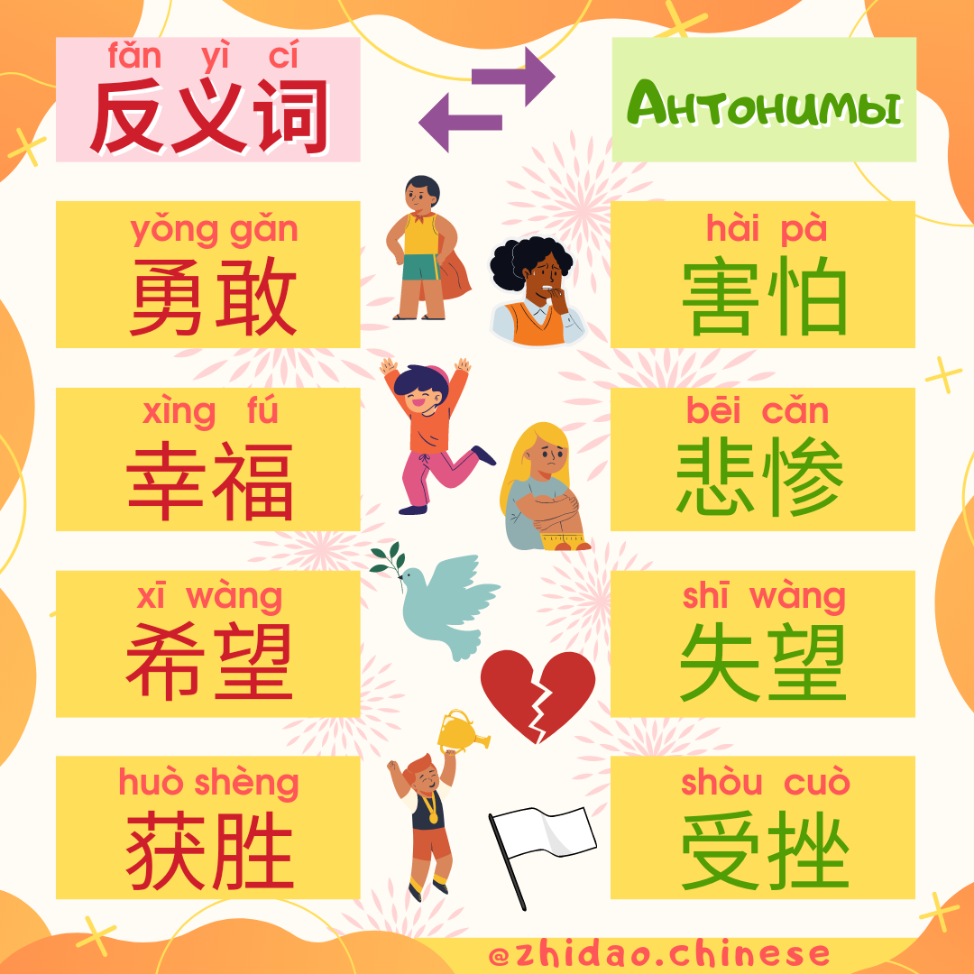 #zhidao_антонимы Сегодня вас ждет новая подборка антонимов - слов с противоположными значениями! Такие слова по-китайски называются (反义词 fǎnyìcí) ↔️ 🔊 Открывайте видео и включайте звук, чтобы услышать, как произносится каждое слово! 🔸勇敢 yǒnggǎn храбрый, решительный 🔹害怕 hàipà бояться, пугаться 🔸幸福 xìngfú счастье, благополучие, счастливый 🔹悲惨 bēicǎn горестный, трагический 🔸希望 xīwàng надеяться, надежда 🔹失望 shīwàng потерять надежду, разочарование 🔸获胜 huòshèng одерживать победу, побеждать 🔹受挫 shòucuò потерпеть неудачу, расстроенный 📝 Ссылка на карточки Quizlet для изучения новых слов: https://quizlet.com/_cr9jf5?x=1jqt&i=2r5snr 📚 Хотите, чтобы Вы или Ваш ребенок заговорили на китайском? Напишите нам для записи на групповые / индивидуальные занятия! 🎓 #china #chinese #школакитайского #китайский #москва #язык #китайскиймосква #учукитайский