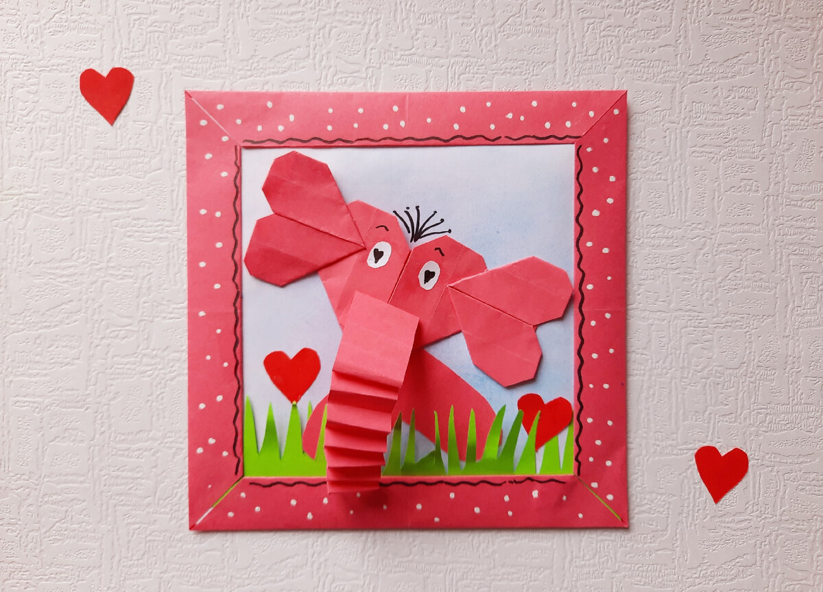 Влюбленный розовый слон - отличный подарок для романтичных натур. Как вы заметили, слон состоит из сердечек. А сердечко - очень распространенный символ, причем, не только любви, но и правдивости, признательности, одобрения, благодарности и т.д. Впереди много праздников. Слоник подойдет для любого, ну кроме Масленицы))) Да и то, если в хоботок дать блинчик, сгодится и на Масленицу))). Я шучу, конечно). Он совсем. как в детской песенке: "...Был он снаружи чуть мешковат: добрые уши, ласковый взгляд..." Итак, потребуется лист розовой бумаги формата А4, белый квадрат 15Х15 кв. см. и зелёные лоскутки для травки. Из А4 делаем большой квадрат. Находим в нём вторую диагональ и начинаем складывать простую рамочку. Все углы квадрата складываются к центру и разворачиваются. Балее углы складываются к середине маленького квадрата, который образован складками. Треугольные углы становятся трапециями. Верхние стороны трапеции нужно согнуть опять к сторонам маленького квадрата, образованного склад