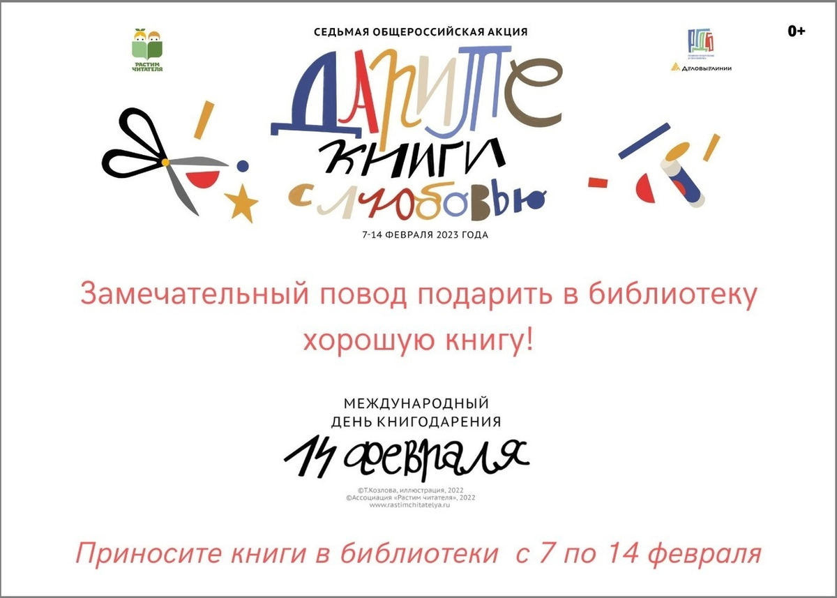 Общероссийская акция «Дарите книги с любовью!» пройдет в седьмой раз. Акция приурочена к Международному дню книгодарения, который отмечается 14 февраля во многих странах мира. Проводится Ассоциацией деятелей культуры «Растим читателя» при поддержке Российской государственной детской библиотеки. Цель акции – cобрать книги для нуждающихся библиотек, которым так не хватает новых книг для пополнения и обновления фондов.