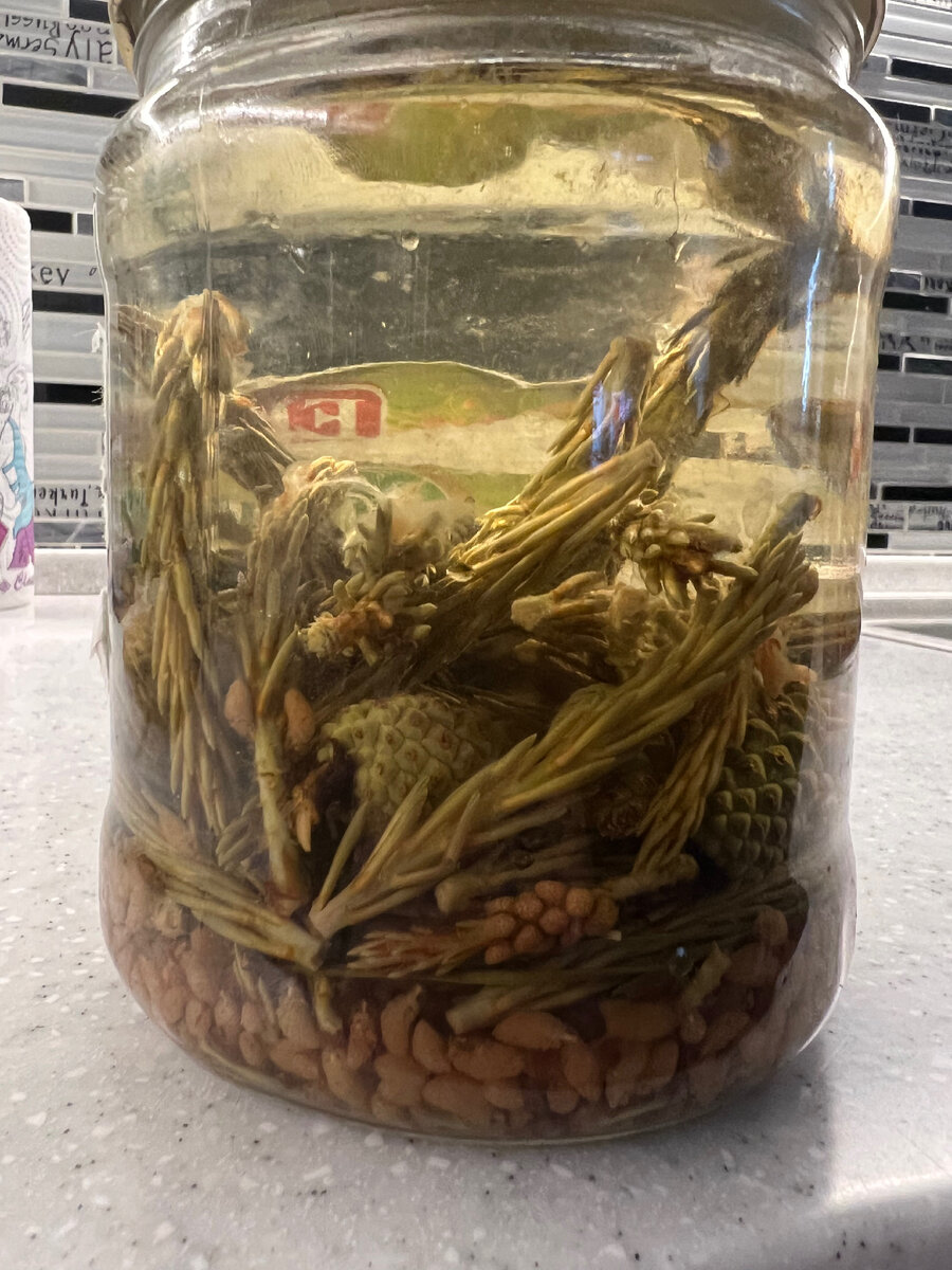Первый - забиваем баночку сосновыми приростами, цветочными почками с пыльцой и я еще добавляю маленькие, только образовавшиеся шишечки и заливаем мёдом.
